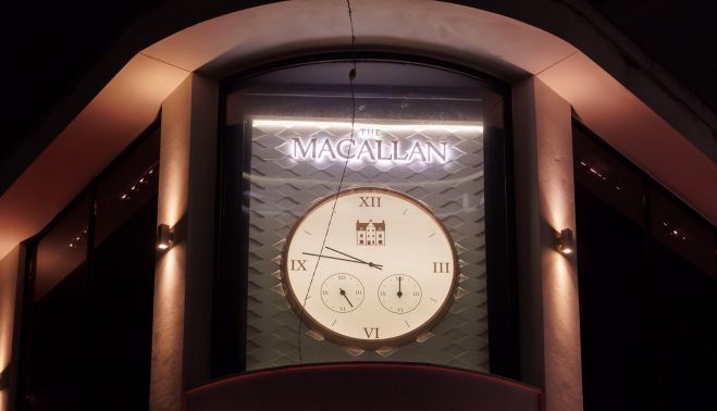La Vega, la histórica cafetería reconvertida exclusivamente en un bar de copas por los nuevos gestores, tiene desde hace unas semanas un nuevo atractivo en su exterior: un reloj publicitario de The Macallan, la prestigiosa marca premium de whisky escocés con importantes intereses en Jerez (en empresas como Estévez, Tevasa y Vasima). Ese reloj está en perfecta sintonía con la decoración exterior del local, y es, precisamente por la noche, con la iluminación muy a la americana del local, cuando más llama la atención.