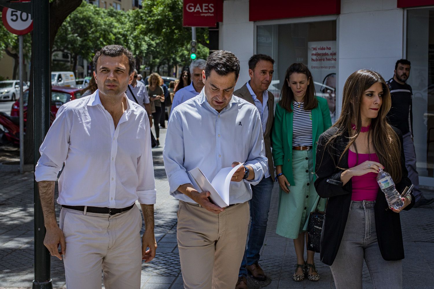 Nada más comenzar el recorrido electoral, una vez acabado el corro con los medios, pidió la palabra una mujer mayor ataviada con un andador. Esos complementos han aparecido por centenares en la ciudad -ya con uno de cada cuatro habitantes por encima de los 65 años- en los últimos diez años. La anciana le reprochó al presidente de la Junta que el SAS haya dejado de costear el calzado ortopédico que necesita, sólo un año después de que le aprobasen la ayuda. "Me voy a interesar por eso, esté usted segura", contestaba Moreno en una exhibición de la campechanía hecha marca personal.