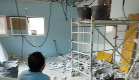 Los trabajadores del centro de salud de La Laguna denuncian correr grave peligro al tener que trabajar mientras se está realizando trabajos de albañilería de retirada del falso techo de escayola. Los mismo trabajadores han comunicado al Sindicato de Sanidad y Sectores Sociosanitarios de Cádiz de Comisiones Obreras que hay riesgo incluso de derrumbe de las bovedillas de los forjados.