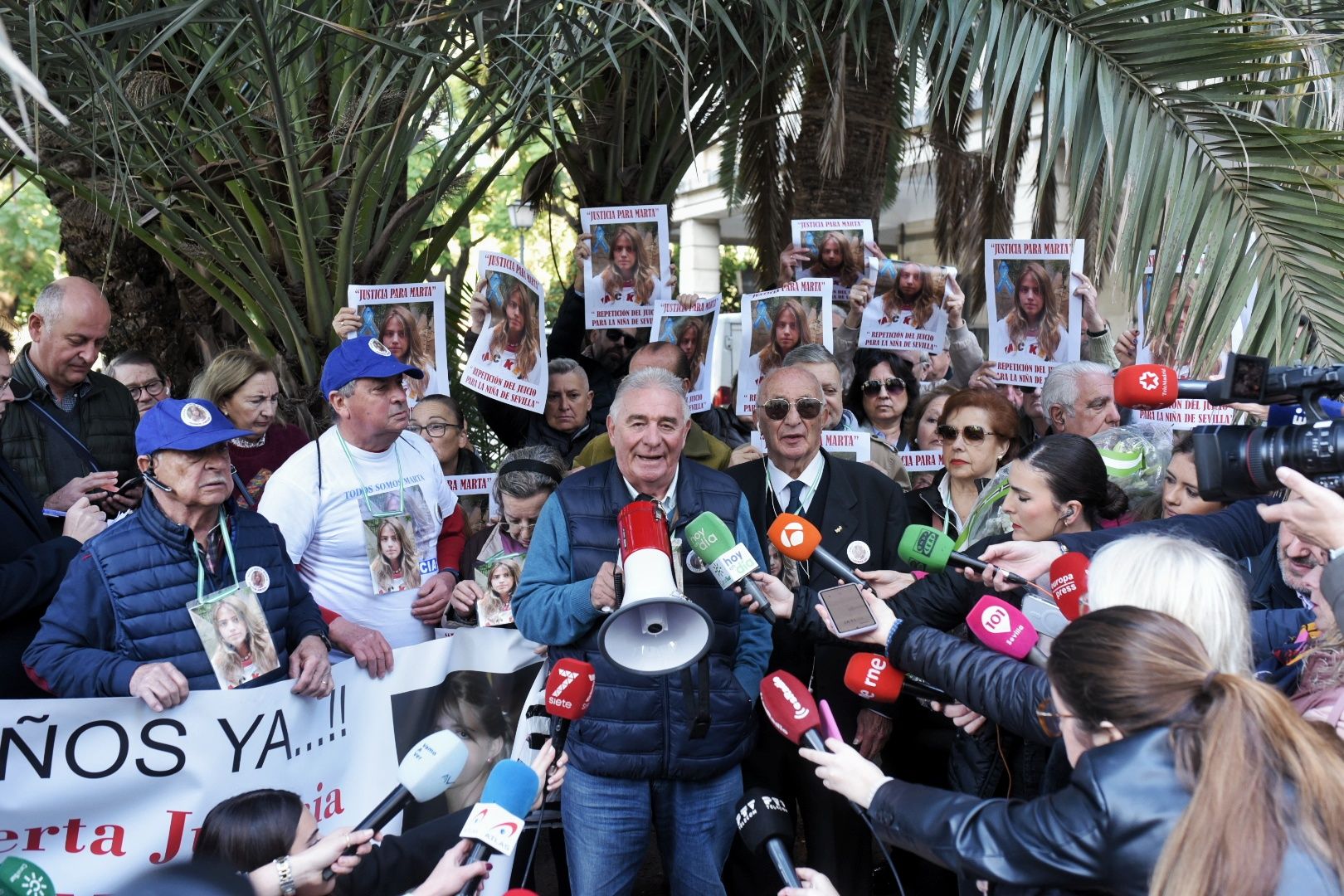 Rompen los aplausos tras la colocación en una palmera de cartel con el rostro de Marta del Castillo que recuerda a la joven sevillana frente a los juzgados hispalenses. Es el punto y final de un acto, pero el punto y seguido en la lucha de José Antonio Casanueva, el abuelo de Marta. Son 15 años de lucha y tiene claro que a sus 87 años de edad no le queda demasiado.