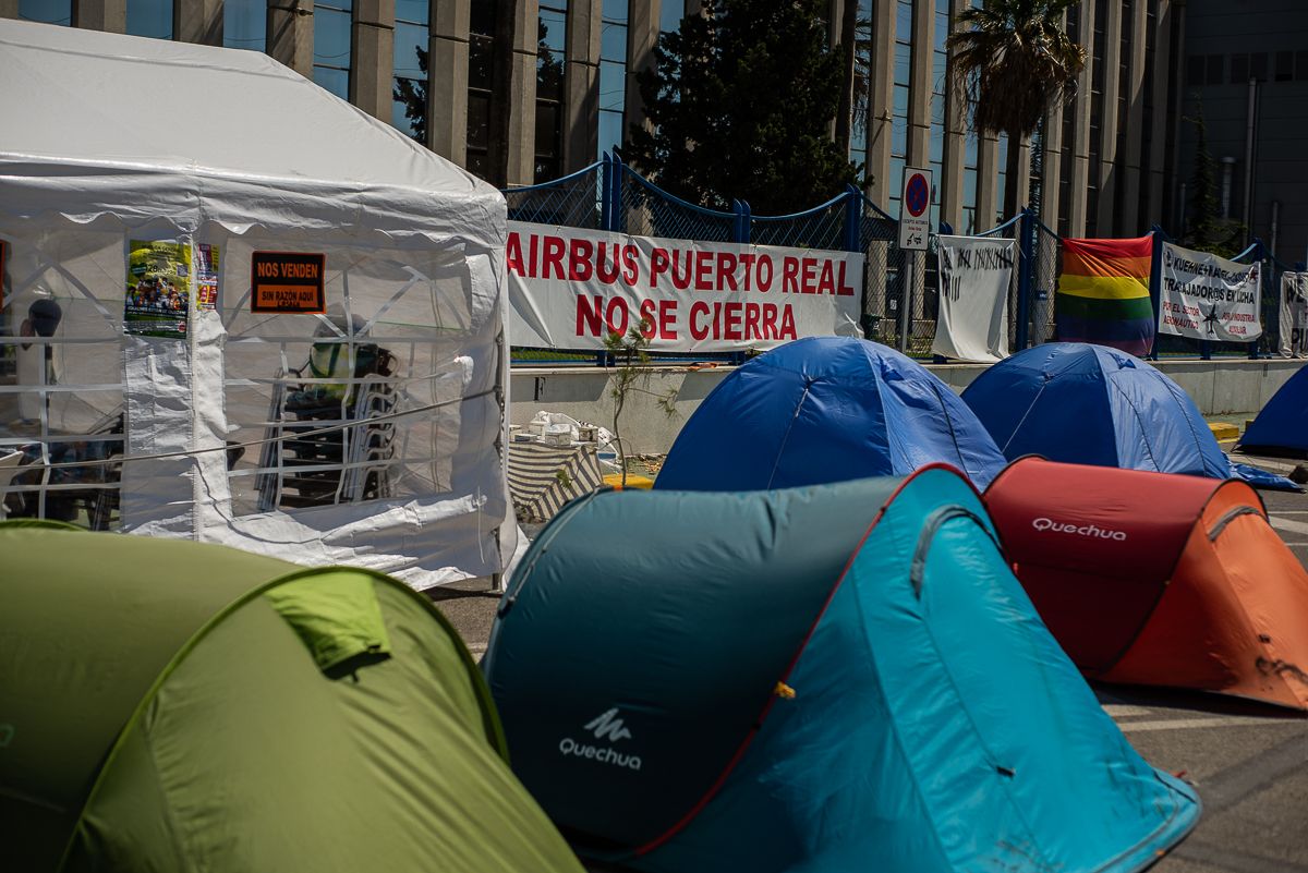 “Quién lucha, puede perder. Quién no lucha, ya perdió”, se puede leer en una gran pancarta. La frase de Bertolt Brecht está escrita en una esquina de la lona, en la que se bautiza la acampada como el “campus de la dignidad”. A las puertas de la planta de Airbus en Puerto Real, una treintena de empleados resiste y mantiene una protesta que durará hasta que “se garantice el empleo”.