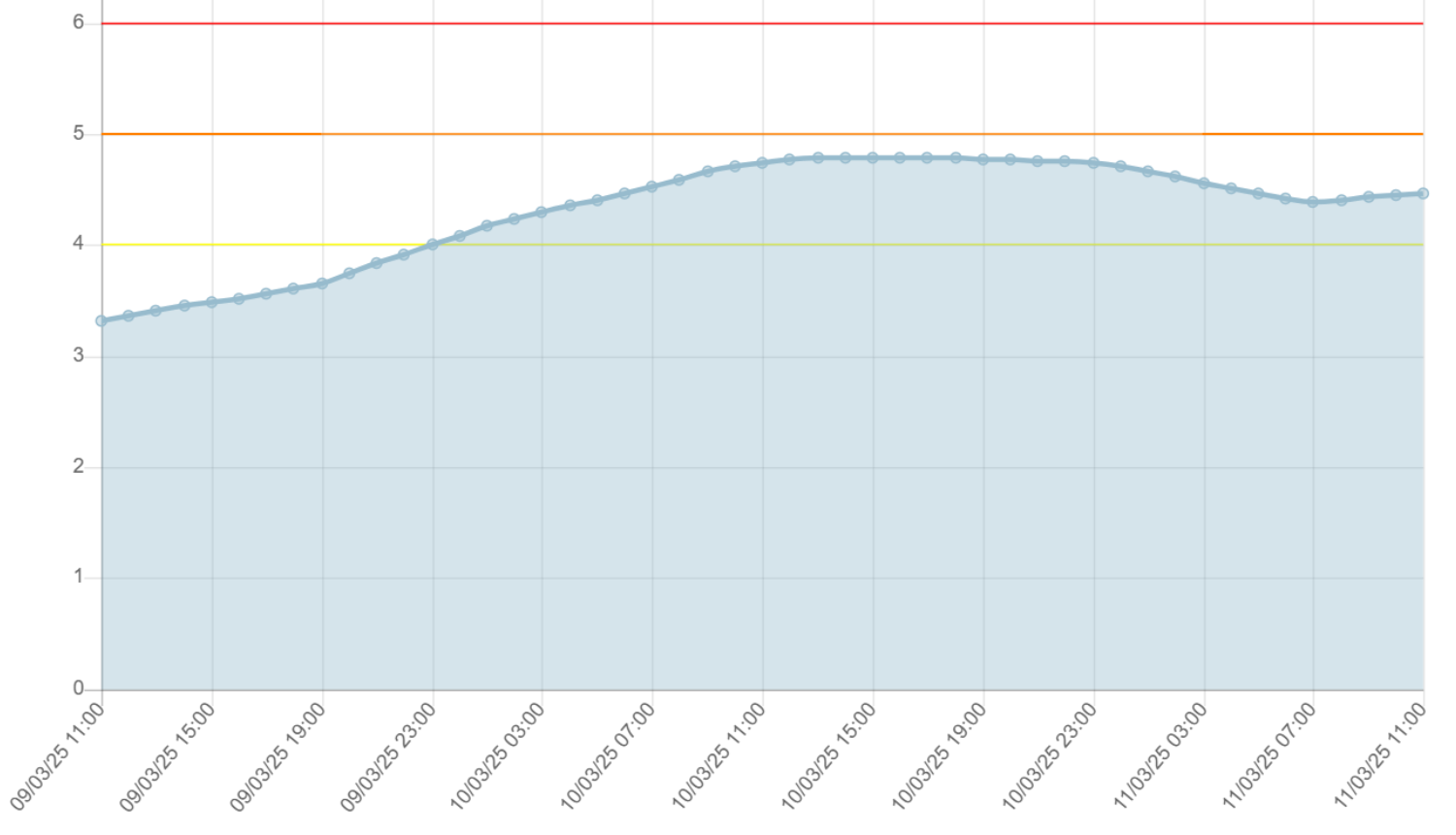 Pero las lluvias en Jerez, el entorno y, sobre todo, la Sierra de Cádiz, ha provocado un aumento hasta los 4,47 metros. Aún resta medio metro, pero las subidas del río no son siempre previsibles. Hay que recordar que el domingo por la mañana apenas estaba en los tres metros y en 24 horas pasó a casi cinco metros, un crecimiento que fue el que alarmó a las administraciones competentes.