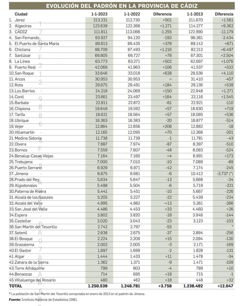 El Instituto Nacional de Estadística (INE) ha hecho oficiales los datos oficiales con las revisiones del padrón municipal de todos los municipios españoles a 1 de enero de 2023 y la provincia de Cádiz en conjunto ha ganado 3.758 habitantes censados, un 12% más que un año antes, lo que deja la cifra total de vecinos y vecinas en 1.250.539.