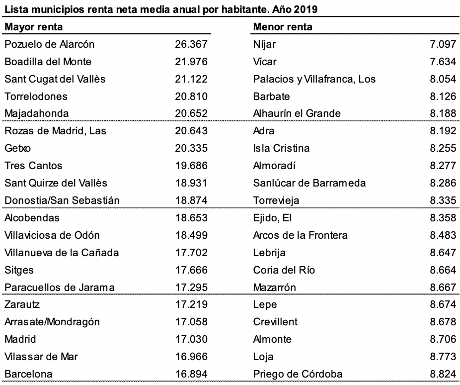 Ya en lo referido a los municipios clasificados por renta media anual por habitante en 2019, Níjar, en Almería, aparece como el último de la tabla, con 7.097 euros, seguido del también almeriense Vícar (7.634 euros), el sevillano Los Palacios y Villafranca (8.054 euros), el gaditano Barbate (8.126 euros) y el malagueño Alhaurín el Grande (8.188 euros).