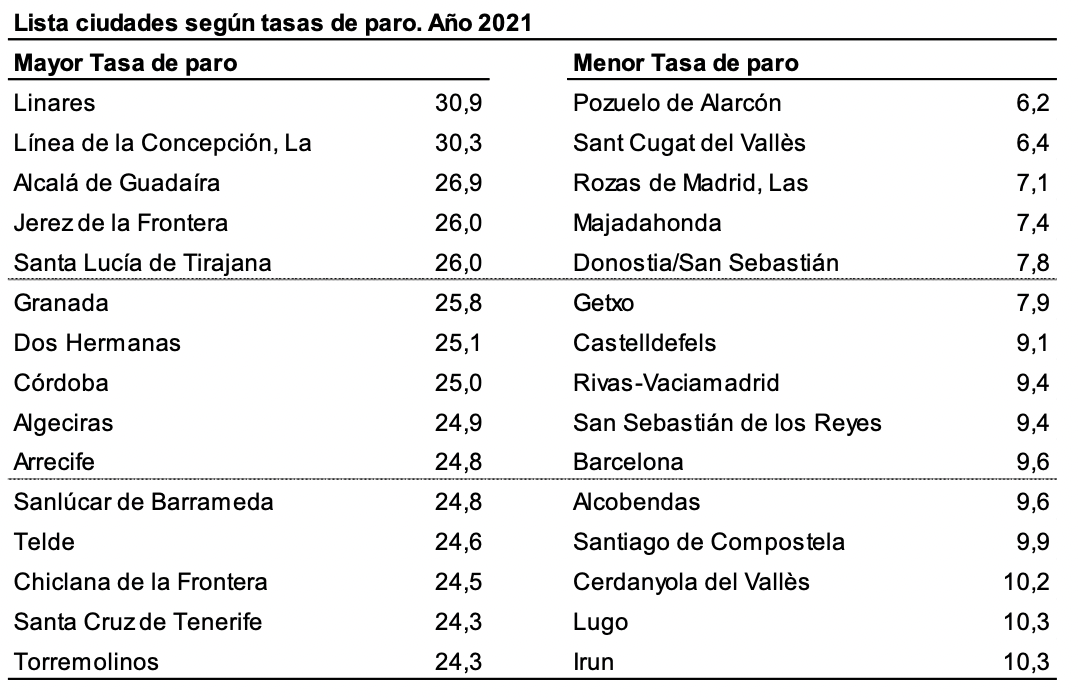 Los datos de la estadística Indicadores Urbanos 2022 muestran un año más que en el ranking de los diez municipios con mayor tasa de paro estimada en 2021, ocho son andaluces. Como se ha dicho, el triste honor de encabezar la tabla lo tiene Linares (30,9%), seguido de La Línea de la Concepción (30,3%), Alcalá de Guadaíra (26,9%), y Jerez de la Frontera (26,00%). Tras el canario Santa Lucía de Tirajana (26,01%), aparecen de nuevo localidades andaluzas: Granada (25,8%), Dos Hermanas (25,1%), Córdoba (25%), Algeciras (24,9%), para cerrar la lista de diez municipios el también canario Arrecife (24,84%).