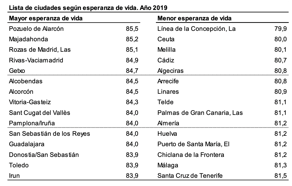 Según se desprende del informe, tres municipios superaron los 85 años, todos ellos de Madrid: Pozuelo de Alarcón, Majadahonda y Las Rozas de Madrid. En el extremo opuesto, La Línea de la Concepción fue la única de las 126 ciudades estudiadas con una esperanza de vida al nacimiento inferior a 80 años. Nueve de las quince poblaciones con menor esperanza de vida de España están en Andalucía.