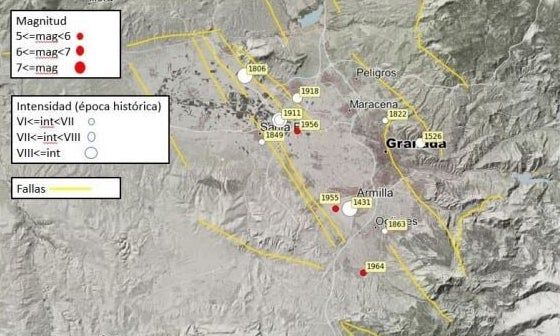 Los terremotos de 1531 en la cuenca de Baza tuvieron una intensidad ocho-nueve y el de 1804 en la cuenca de Dalías, una intensidad ocho-nueve, que produjo gran destrucción en Dalias, Berja y Roquetas y 407 víctimas. Con intensidad de ocho están los movimientos registrados en 1806-1807 en Pinos Puente. En 1918 se registró un terremoto de siete grados en Santa Fe, y de la misma intensidad en Atarfe en 1918.