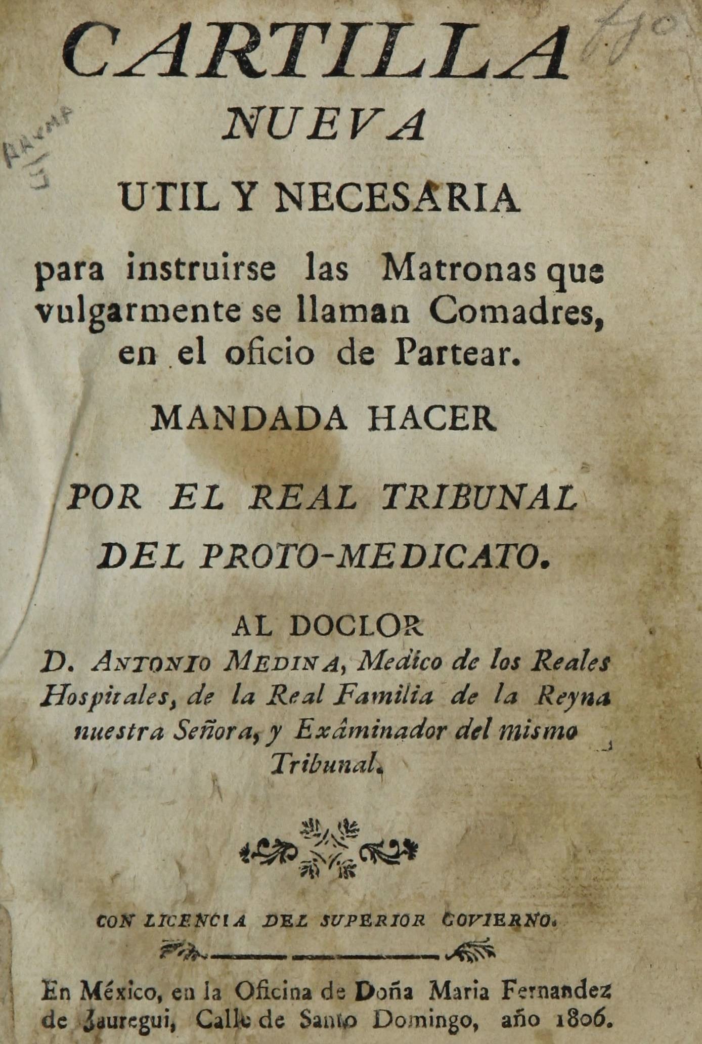 (5) Medina, Antonio: Cartilla nueva, útil y necesaria para instruirse a las Matronas que vulgarmente se llaman comadres en el oficio de partear…, Oficina de Doña María Fernández de Aguirre, México, 1806. Puede verse una visión general de la evolución del oficio de matrona desde sus orígenes al saber científico en Conde Fernández, Fernando: “Parteras, comadres, matronas. Evolución de la profesión desde el saber popular al conocimiento científico”, Colección Discursos Académicos, Discurso leído en el acto de recepción como académico numerario, 2001. Disponible en: http://www.academiadelanzarote.es/Discursos/Discurso%2049.pdf