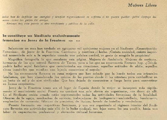 Artículo publicado en la revista Mujeres Libres sobre el nacimiento del Sindicato de Emancipación Femenina.La jerezana fue condenada a seis años de prisión por el delito de auxilio a la rebelión por su militancia anarquista, “por haber pertenecido a una organización legal antes de la sublevación, tener ideas anarquistas, como si el pensamiento delinquiera, y crear un taller de costura que proporcionó ropas al ejército enemigo”, esgrime Gutiérrez Molina, quien matiza: “María Luisa Cobo tenía suerte. Otros, por lo mismo o, incluso, por menos, habían pagado con su vida. Aunque por delante le quedaban, además, de los años de cárcel una existencia como exiliada interior. La peor de las condenas a las que se sometió a una población que soñó con un mundo mejor y se opuso a una rebelión militar”.“Mi tía tenía valores de solidaridad, quería ayudar a demás, no sólo para darles de comer, también para enseñarles a pescar”, cuenta Francisco Reinoso, sobrino de María Luisa Cobo, quien recuerda que tanto ella como su marido “habían tomado conciencia de lo que era un sindicato” y “querían la emancipación de las mujeres”. El homenaje que se le rinde, 45 años después de su muerte, acaba con la interpretación de varias canciones por parte del grupo El Domador de Medusas, que interpreta el Himno de Mujeres Libres:Puño en alto mujeres de Iberiahacia horizontes preñados de luzpor rutas ardientes,los pies en la tierrala frente en lo azul.