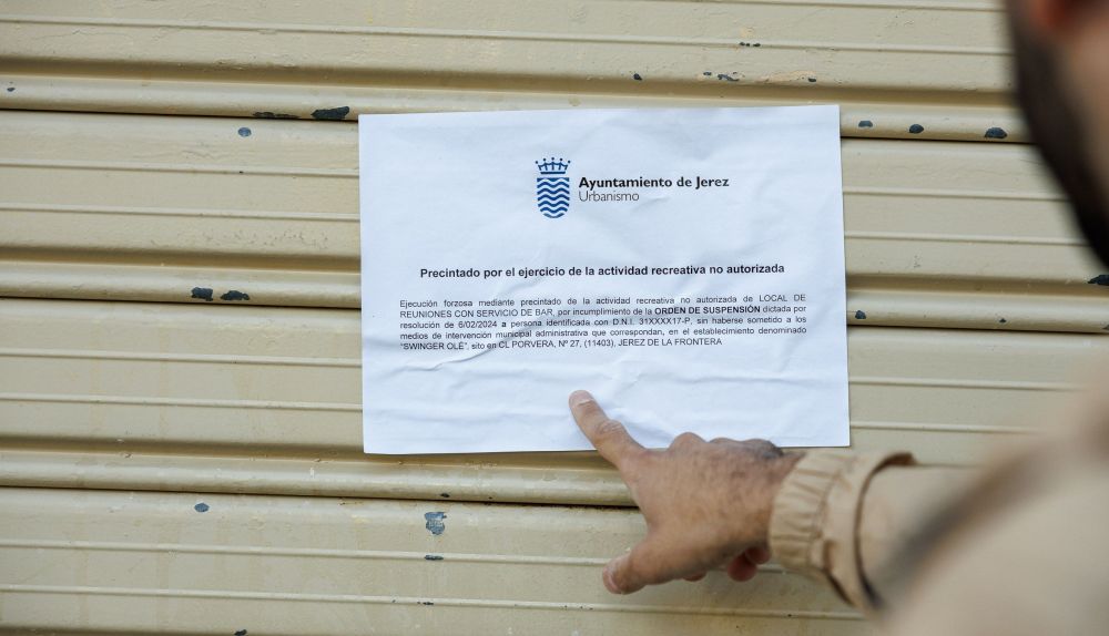 La delegación de Urbanismo del Ayuntamiento de Jerez, a través de Disciplina Urbanística, ha precintado un club de intercambio de parejas en la calle Porvera por "el ejercicio de actividad recreativa no autorizada". Al menos eso se lee en la comunicación adherida a la puerta del establecimiento desde hace unos días.