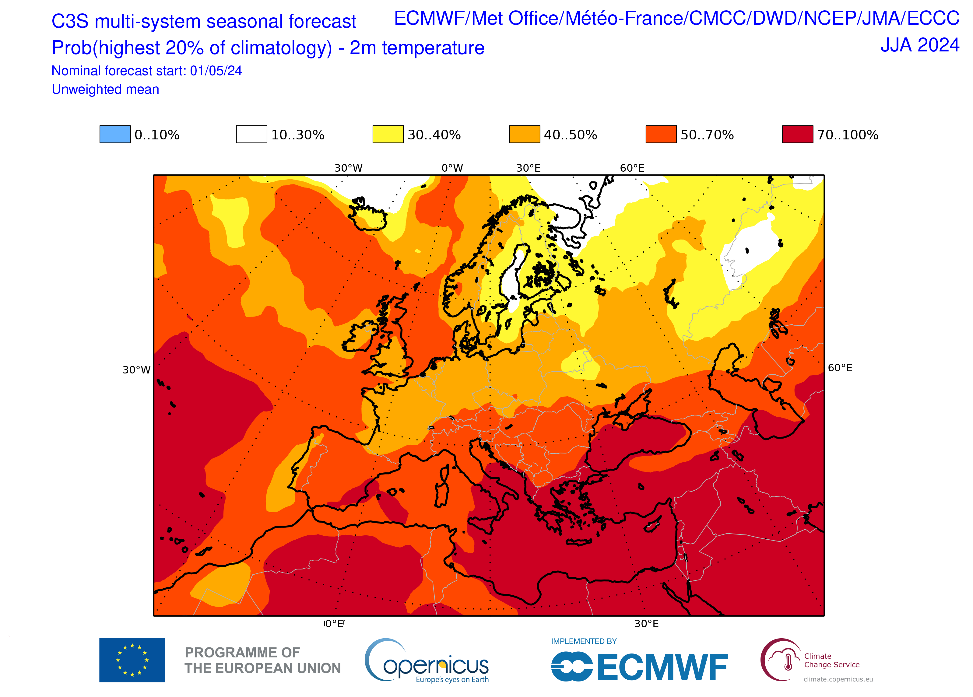 Las temperaturas extremadamente altas podrán venir en forma de olas de calor o ser periodos sostenidos por encima de la media. Esta predicción de Copernicus se extiende prácticamente a toda Europa y al Norte de África.