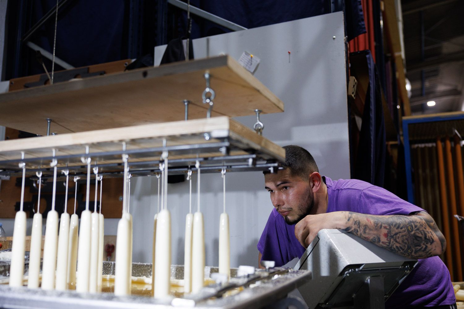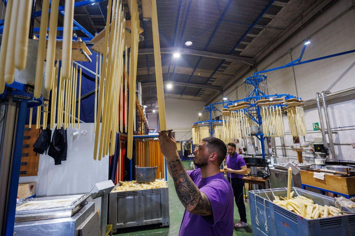 Un operario supervisa los cirios tras cada baño de cera, donde ganan un milímetro de grosor para alcanzar su forma final.