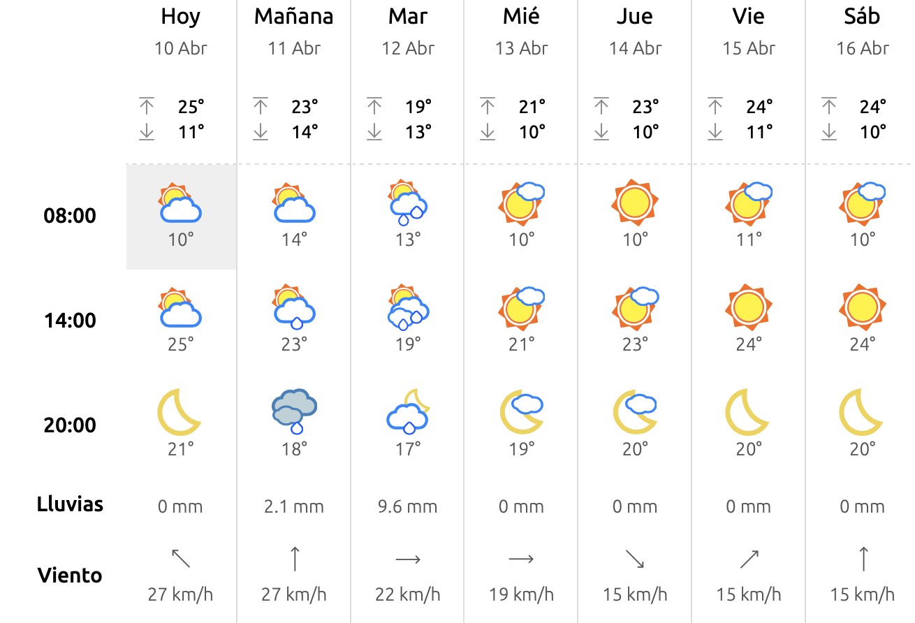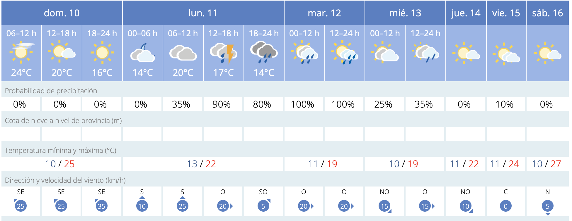 Otro parte consultado es el del tiempo.es, uno de los más populares en la red. Coincide con la AEMET en pronosticar cielos con alternancia de nubes desde la mañana hasta las 16 horas que es cuando ya vaticina la posibilidad de que aparezca la lluvia. El martes podría ser una jornada de chubascos desde primera hora. La probabilidad de que aparezcan disminuye desde las 20 horas.