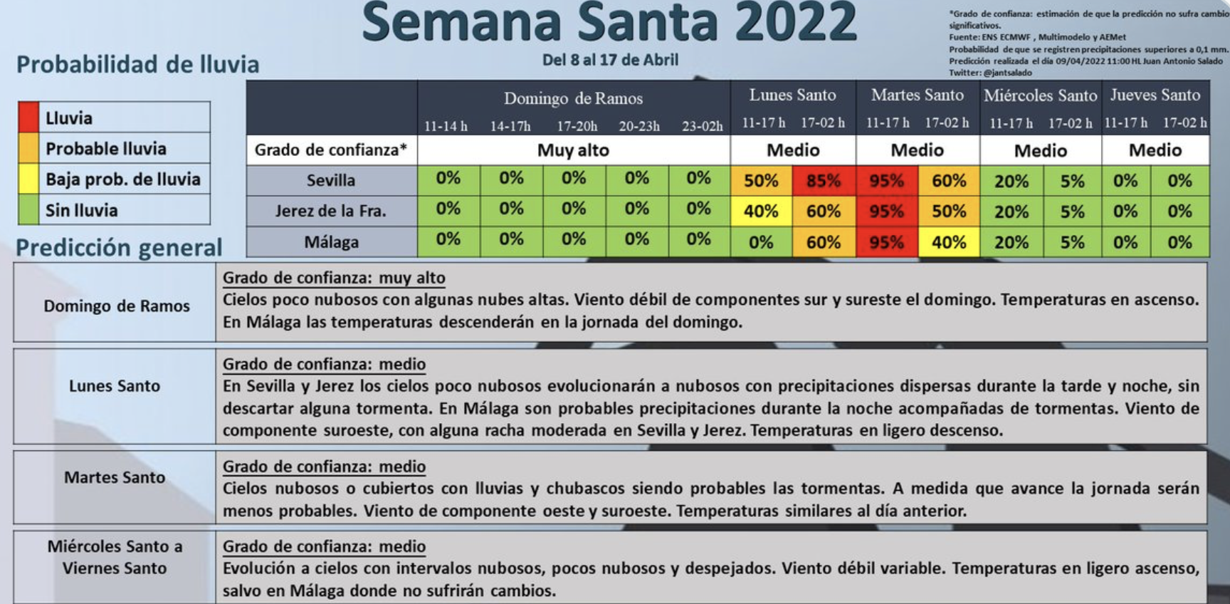 Por último, el meteorólogo jerezano Juan Antonio Salado ha actualizado en su cuenta de Twitter el pronóstico para la semana. Se suma a las malas previsiones para mañana y el martes con un riesgo de lluvia, en las horas que salen las cofradías o están en las calles, entre el 60 y el 50 por ciento.