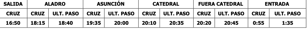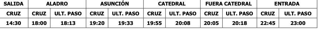 Itinerario: Plaza Nuestro Padre Jesús de la Sagrada Cena, Plaza San Marcos, Plaza Rafael Rivero, Puerta de Sevilla, Porvera, San Juan de Dios, San Juan Grande, Plaza Mamelón (Carruaje), Sevilla, Eguiluz, Plaza Aladro, Palquillo, CARRERA OFICIAL, Reducto Alto, Encarnación, De la Rosa, Manuel María González, Pozuelo, Pz. Vargas, Letrados, Asunción, Chapinería, Sedería, Plateros, Plaza Santo Ángel, Tornería, Plaza Rafael Rivero, Plaza San Marcos, Plaza Nuestro Padre Jesús de la Sagrada Cena.