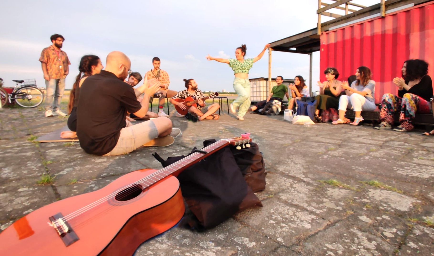 El antiguo aeropuerto de Tempelhof ahora es el mayor parque público de Berlín, un lugar lleno de pistas kilométricas salpicadas de zonas verdes, un espacio de ocio para los berlineses. Aquí, cada domingo tiene lugar un juerga que aglutina a todos los aficionados flamencos de Berlín. Como tantos proyectos, fue la pandemia y el cierre de las escuelas lo que provocó que un grupo de amigos sintieran la necesidad de seguir bailando en sitios al aire libre, y en esta búsqueda encontraron un pequeño escenario de madera en este parque, "de una dificultad surge una oportunidad”.