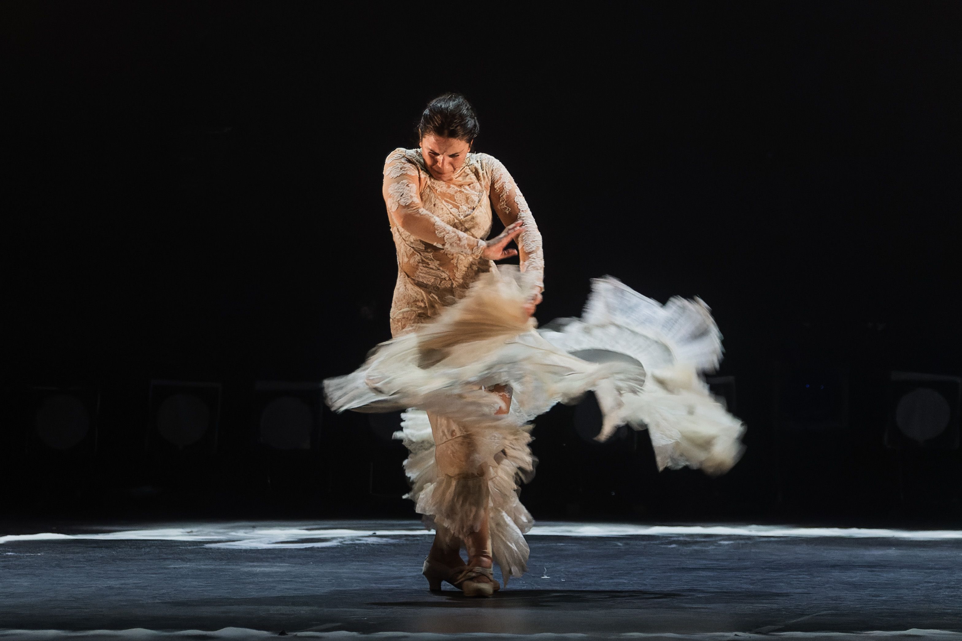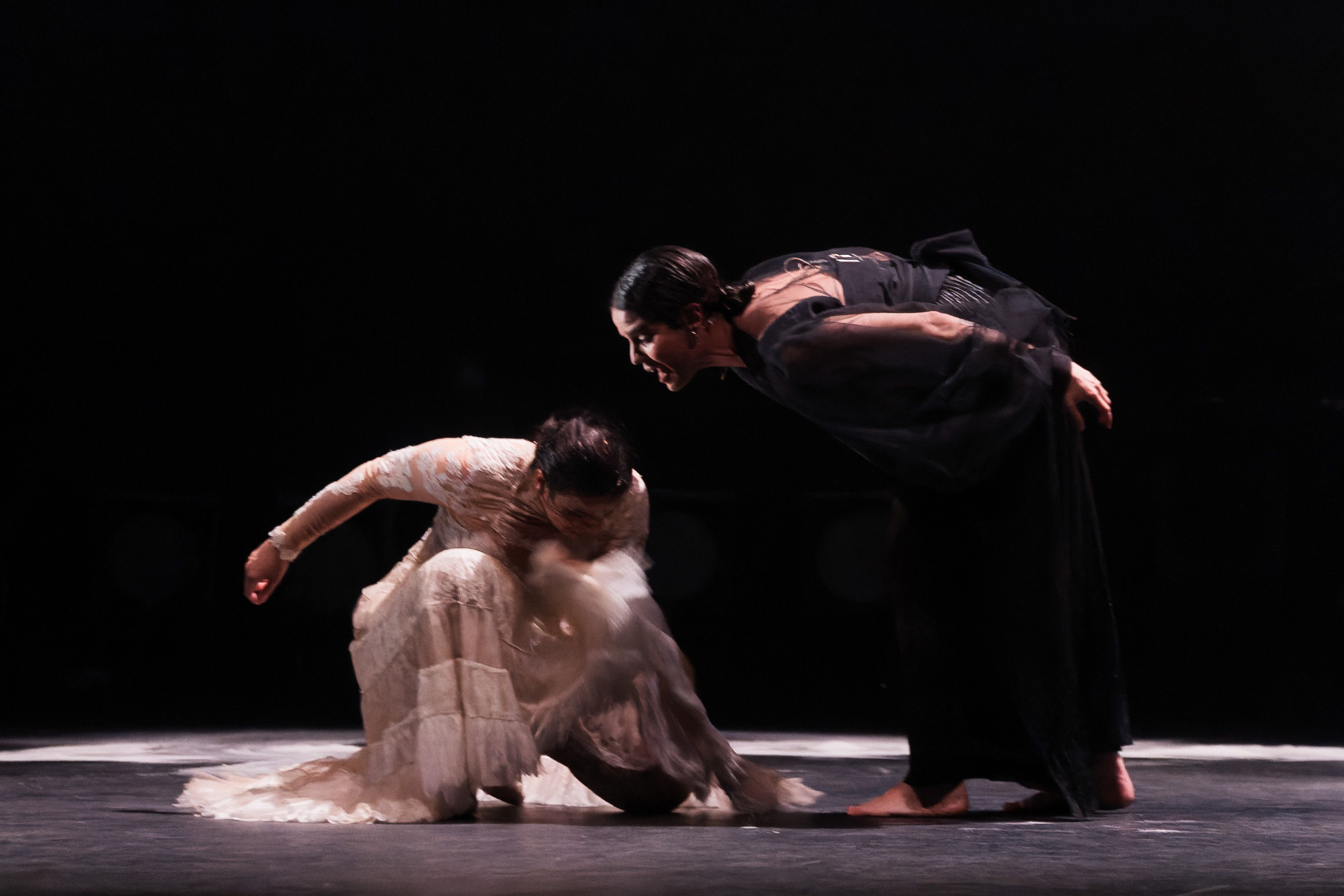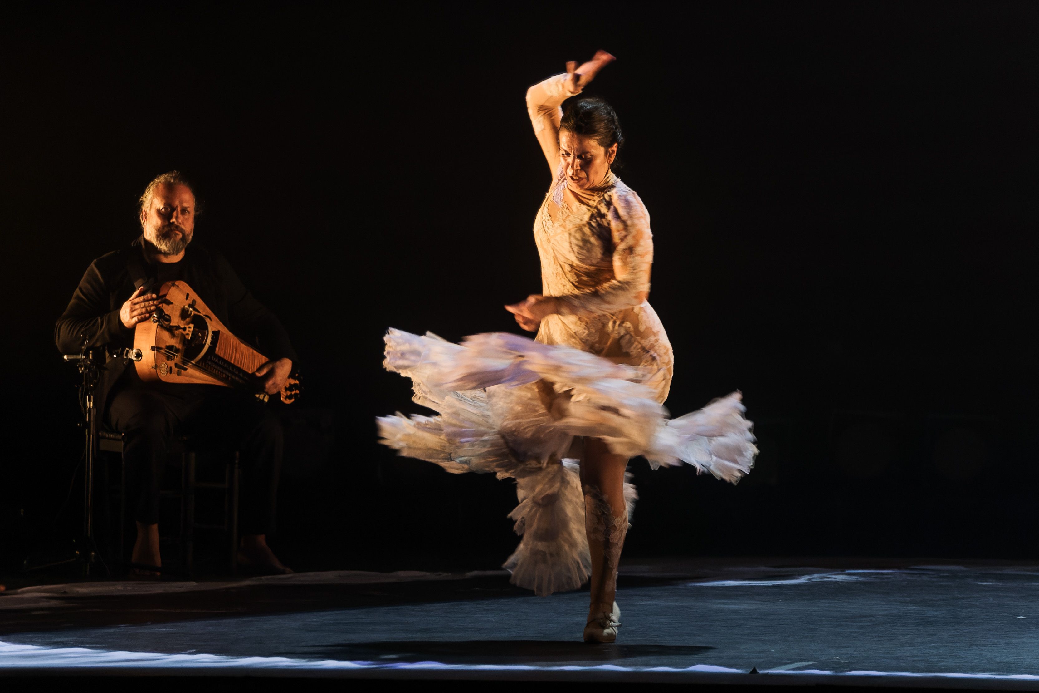 El inquietante diseño del espacio sonoro y la zanfoña de Raúl Cantizano, la guitarra y partitura para los cambios de Eduardo Trassiera, y esa dirección musical con el sello de Pablo Martín Caminero, todos ellos talentosos músicos que siempre contribuyen a engrandecer los espectáculos flamencos, empastan a las mil maravillas con el eco mineral de una gran promesa del cante, Ángeles Toledano, y por encima de todo, con el baile de extremos que navega con calma y naturalidad entre las dos orillas —la tradición y su época— de Moreno.