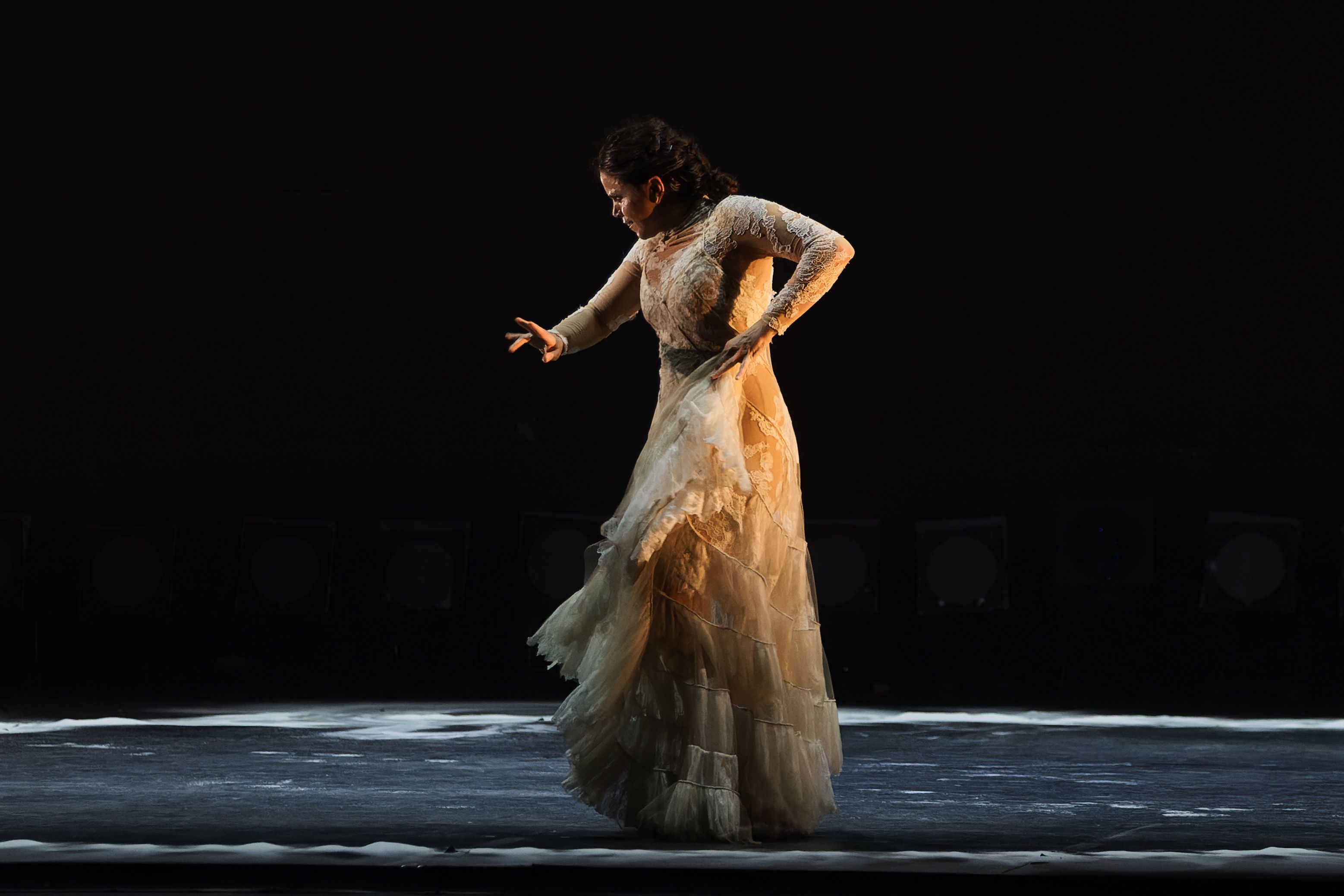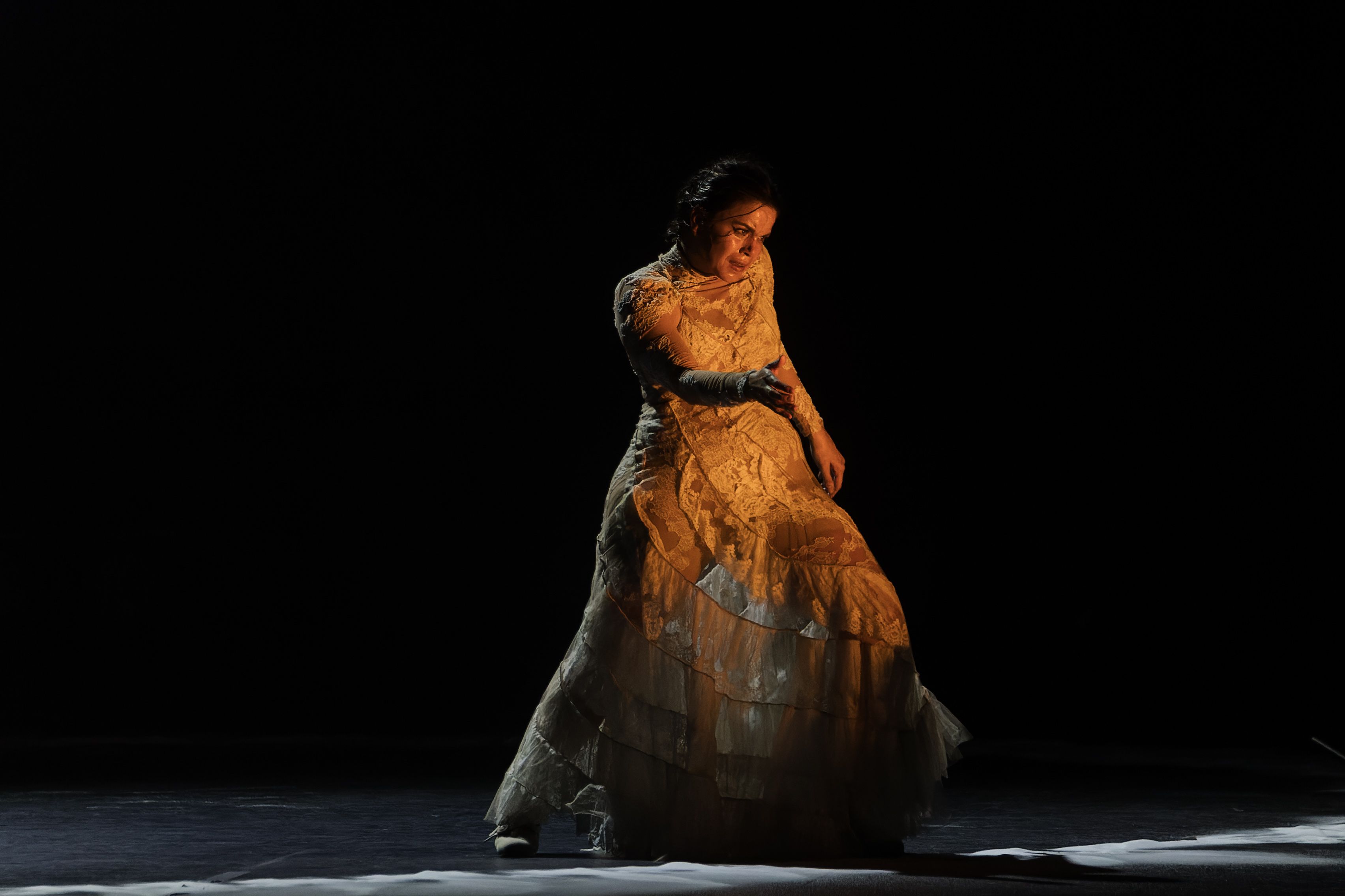 María Moreno ha mantenido en O../O../.O/O./O. (soleá), que ha presentado en la penúltima jornada de la edición número 27 del Festival de Jerez, a Rafael R. Villalobos y Palomo Spain como parte del equipo artístico que la escoltó a nivel de espacio escénico y vestuario, respectivamente, en More (no) more, el trabajo que pudimos verle el pasado año en la muestra y con el que tomó pista de despegue en 2020 para sobrevolar directamente el cielo de la danza flamenca contemporánea.