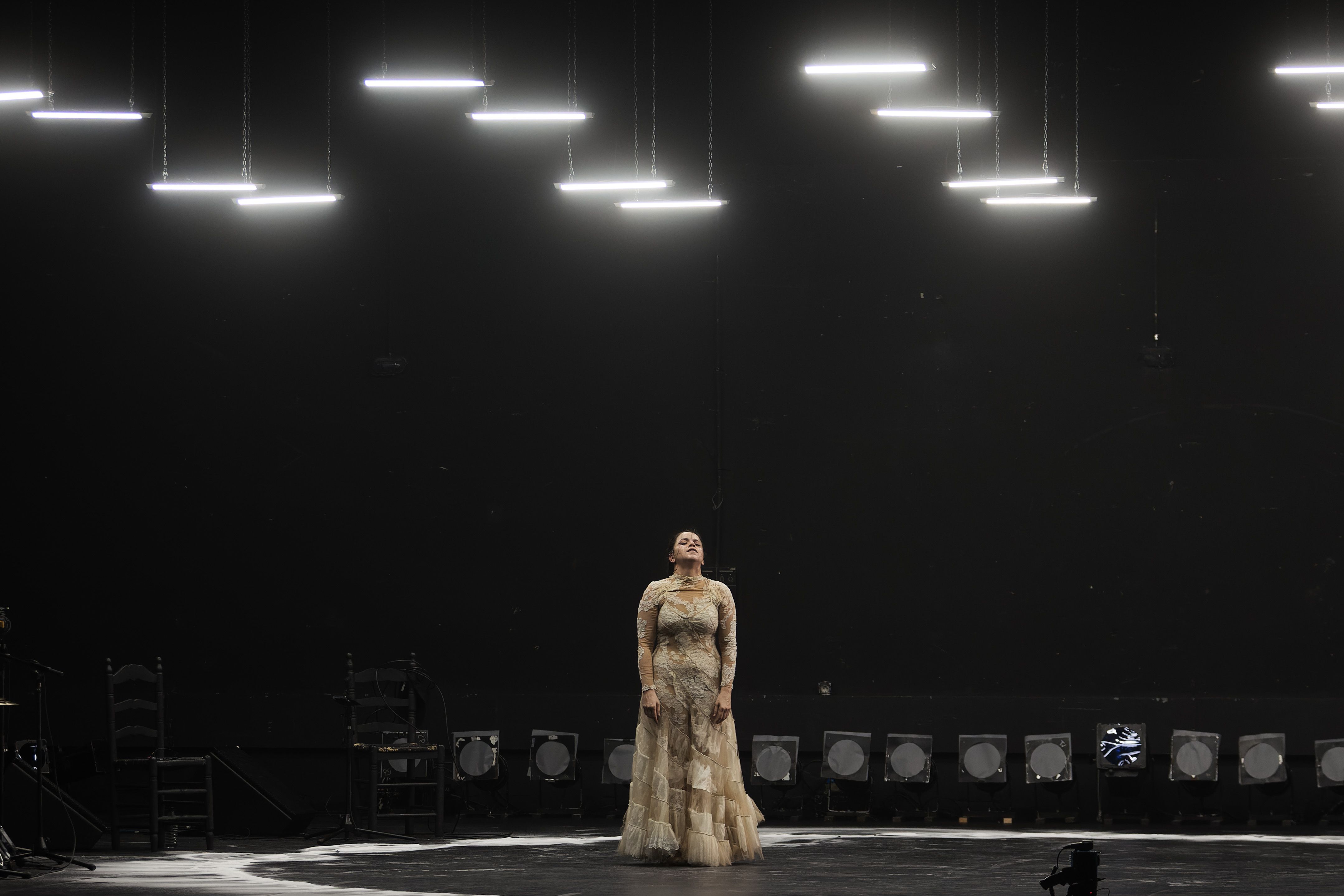 Sin embargo, si el anterior espectáculo se defendía casi por entero con el baile voraz y atávico de esta gaditana, ahora brinda un contundente paso adelante gracias a la inconmensurable labor de sus acompañantes en la tabla. Y aunque la sinopsis hable de una única soléa que entronca con el origen de los tiempos, más bien se trata de ser piedra, ser arrojada al mar y recuperar el centro de gravedad. Un tren inferior que mueve María a la velocidad de la luz si quiere, con entre otras cosas su ya célebre carrerilla, o que congela bajo la luz fluorescente de una morgue —gran trabajo de Antonio Valiente en el diseño de iluminación—.