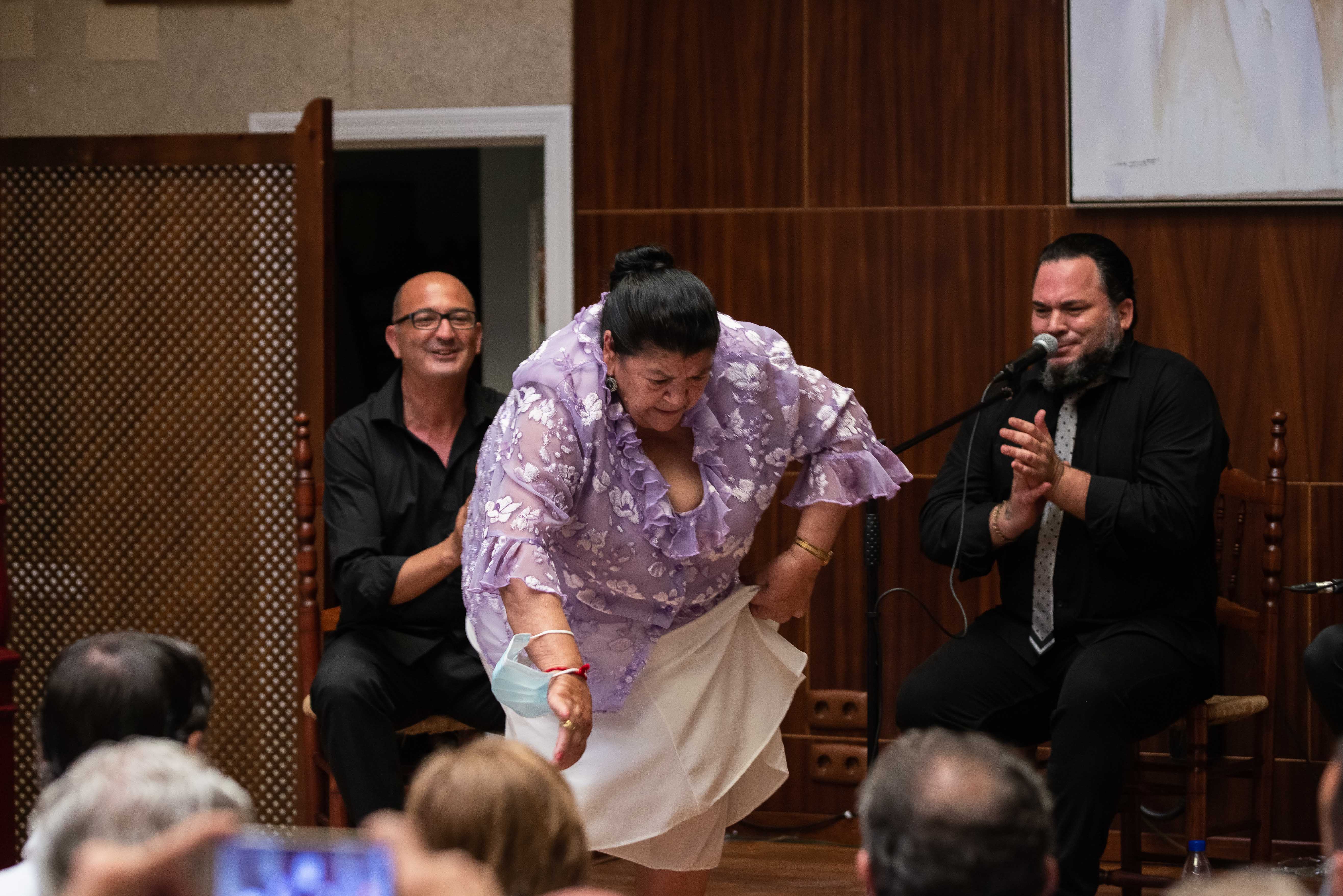 Lleva como socio desde el año 1938, y a sus 88 años, con guayabera rosa y copa de fino en mano, sigue a pie de peña, recordando historias y disfrutando del flamenco desde un lugar privilegiado, y es que tiene un sitio de honor en el reservado junto al escenario. “Te voy a contar una historia muy bonita: un grupo de vecinos del barrio fuimos a la playa de El Puerto de Santa María a coger chinos para hacer el suelo de la primitiva peña, un local que estaba aquí al lado. Fuimos con los canastos y volvimos llenos de piedras”, nos cuenta Manuel, quién fundó, desde el suelo, esta legendario lugar.