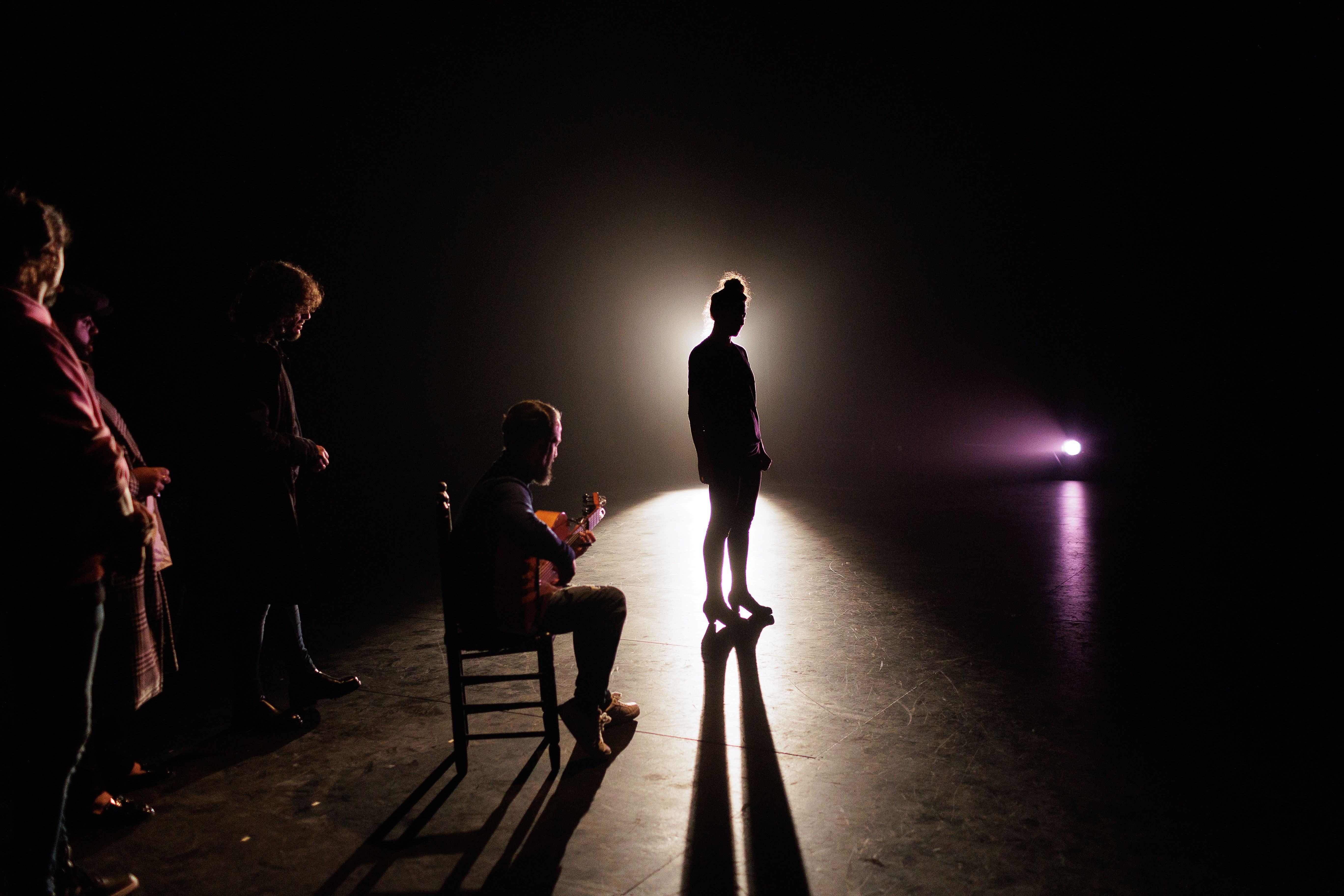 El espectáculo se estrenó en La Bienal de Sevilla y a Jerez llega con su segunda representación. Insaciable cuenta con el baile cómplice de Jonatan Miró. El cante de Matías López 'El Mati', Jesús Corbacho, José 'El Pechuguita' y la guitarra de Ramón Amador arropan la función, creando una atmósfera vibrante y muy poética por la que Lucía discurre. Instantes antes de salir a escena, Marta Álvarez, regidora del espectáculo, controla los tiempos y da los avisos para que todos estén prevenidos; Sara Arguijo, asesora artística, infunda ánimos a Lucía con un último abrazo; Jonatan Miró realiza unos estiramientos preparatorios junto a su compañera de baile y 'El Pechugita' busca un cigarro mientras se estira la camisa que, según el cantaor, se ha quedado muy tiesa tras el planchado.