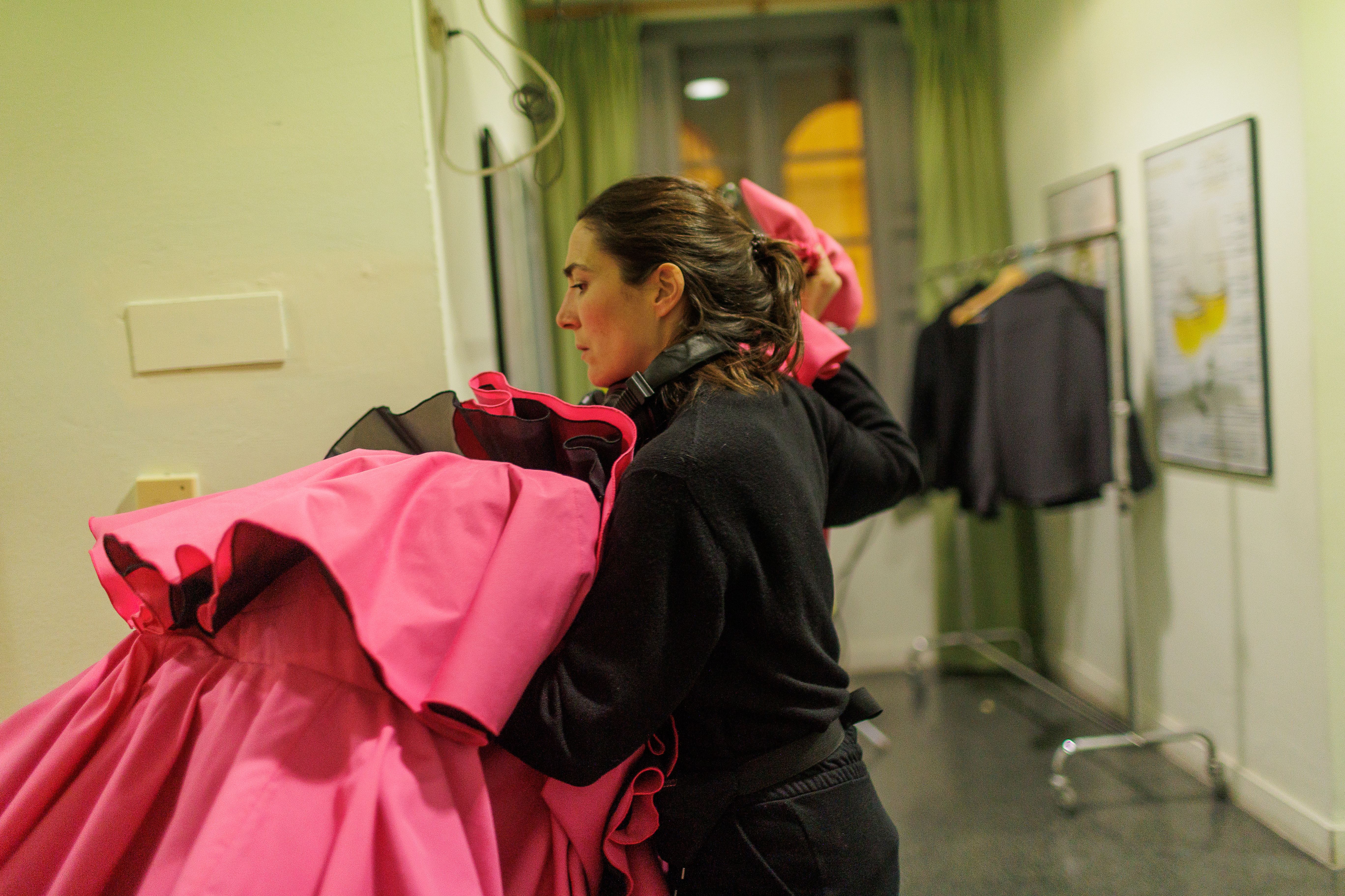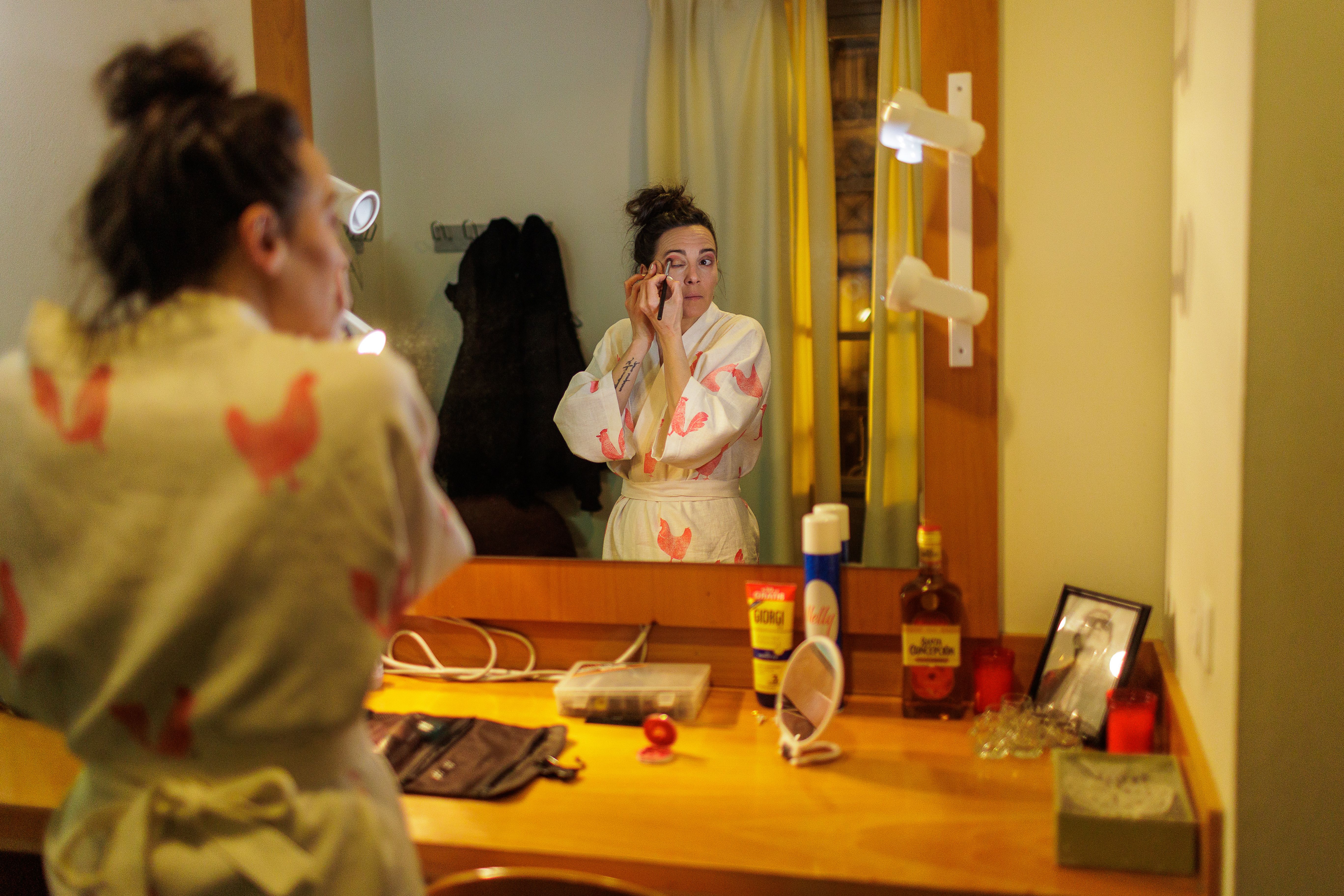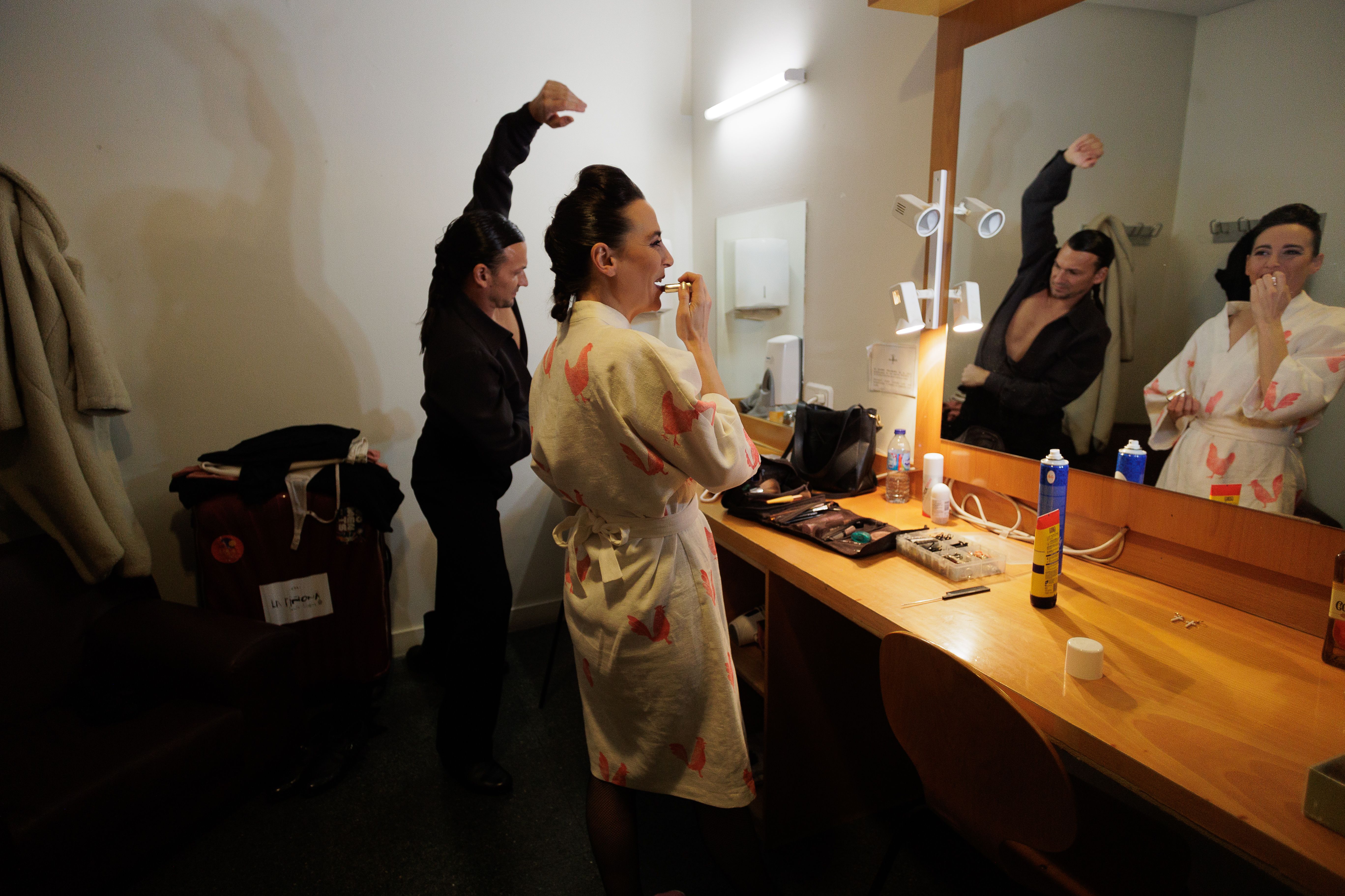 Lucía se peina y maquilla envuelta en una bata con estampación de gallos y gallinas realizada por una artesana de su pueblo, Jimena de la Frontera, y con unas alpargatas rosas. Este proceso de "ponerse guapa" sucede en un ambiente de intimidad, el último rato de recogimiento que la artista tiene para prepararse física y mentalmente. Por si alguien se lo está preguntando, no hay maquilladores ni personal de peluquería. Es ella misma quien se prepara, como ocurre en la mayoría de compañías de flamenco. A la bailaora no le gusta estrenar nada en días de función: "Prefiero las cosas viejas, todo tiene que estar usado", explica.