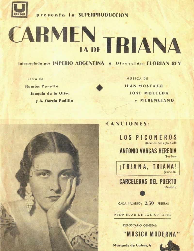 “Los nazis lo que buscaban eran una forma de adentrarse en el mercado hispano americano y esta historia jugaba con los tópicos, pero de forma marcadamente política: una española con un alemán estaría bien vistos al otro lado del océano” abundaba, exponiendo que cuando Florián Rey e Imperio Argentina reciben la misiva del jefe de propaganda de Hitler lo que les proponen es “hacer una Carmen, basándose en el texto de Prosper Mérimée, a la que llamarían Carmen, la de Triana, que se acompañaría con la música y las canciones de José Muñoz Molleda, un compositor de linense que hizo una de las grandes composiciones que tenemos en nuestras bandas sonoras” y cuyas canciones corrieron a cargo de distintos autores, entre los que se encontraban Mostazo, Cola, Padilla, Rey y Perelló, si bien “hay una canción que está compuesta en la parte literaria por el jerezano Antonio Quintero", con lo cual la gente de Jerez también tuvo que ver algo en esta historia.