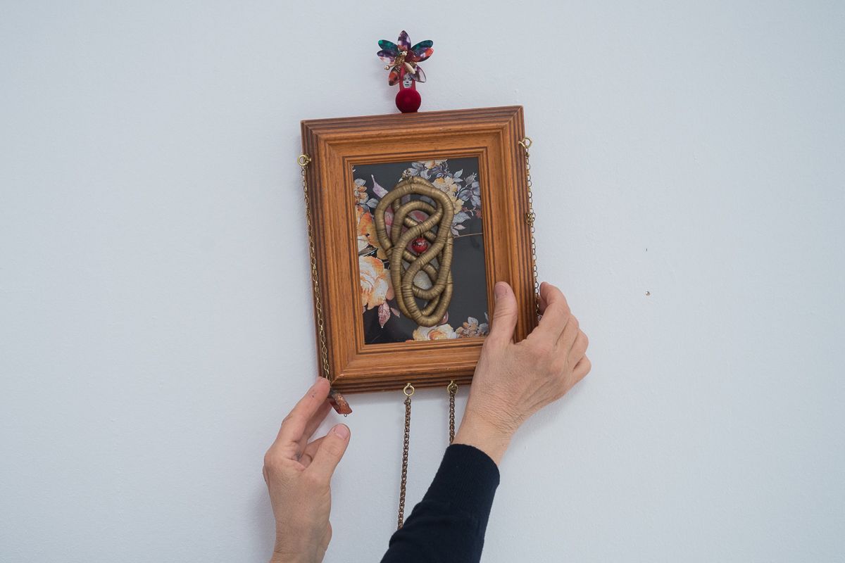 Este cuerpo central, donde aparece siempre destacada la vulva —representada con pelo, perlas, flores muertas o hasta incluso una plancha antigua— está acompañada con collares o cadenas, decorados a su vez con pendientes rotos o abalorios, que hacen de extremidades. Se trata, según la autora, de sacar a la mujer del estereotipo del cuerpo femenino. "No hay cuerpo, sino que lo monto yo con mis piezas, buscando la convivencia entre un material y otro", explica. Tuty mezcla elementos, materiales y, como unión, coloca tocados a todas las mujeres que aparecen representadas en sus piezas, llenas de color y mucho dorado. "Soy una barroca moderna", ríe. Finalmente, la artista jerezana manifiesta, desde lavozdelsur.es, que su muestra "está dedicada a todas las mujeres, a las que están y a las que ya no están. Y a las que pelean para combatir la violencia de género".