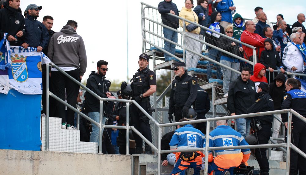 El peligro era muy grande por los agujeros que había en el suelo de las gradas y tuvieron que acudir sanitarios por la caída de algunos aficionados jerezanos. La Policía Nacional ha tenido que desalojar dos gradas, pero realmente había más porque el estado general no parecía apto para acoger a aficionados.