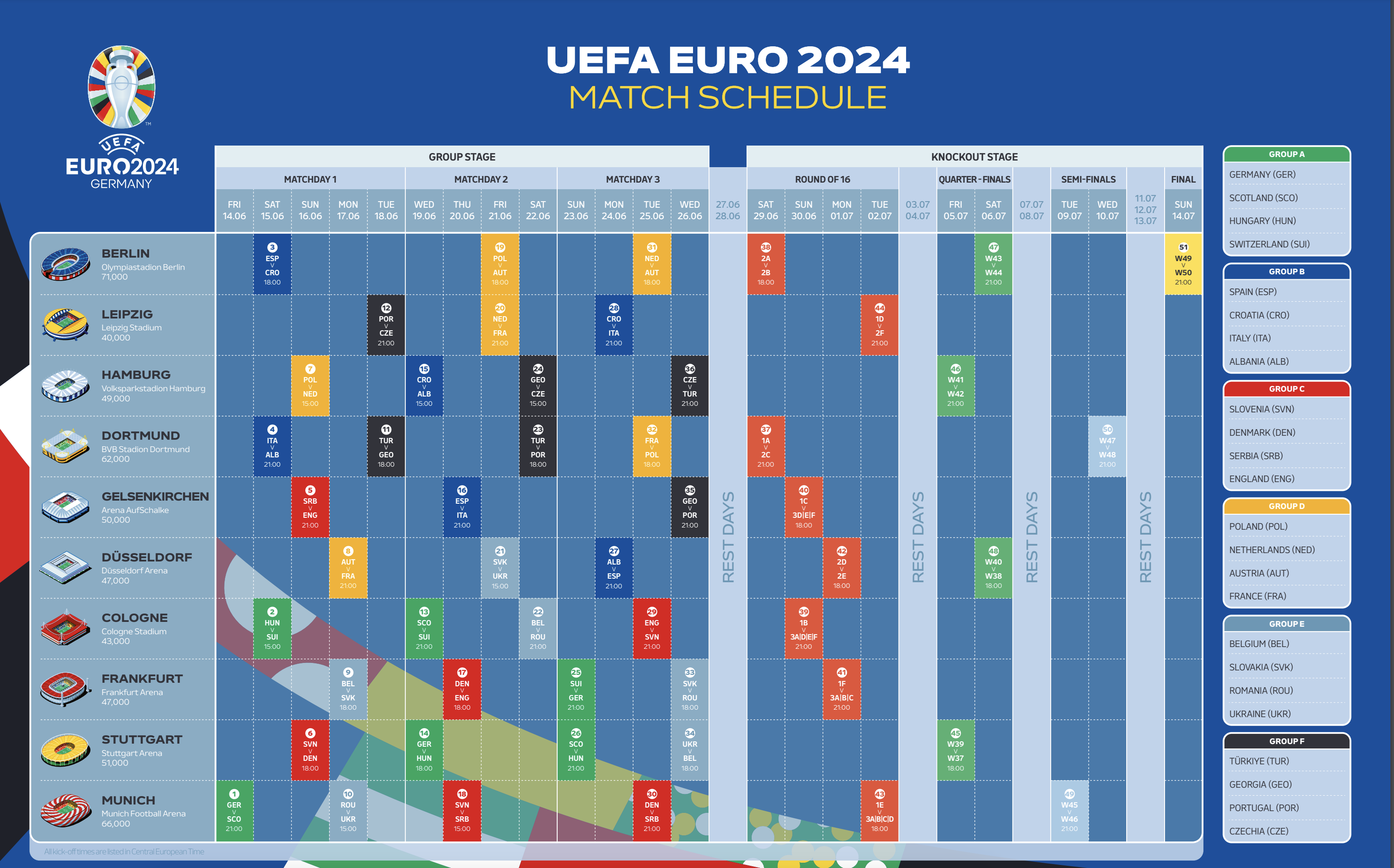 El debut de España llegará este sábado en Berlín frente a Croacia (18 horas). Cinco días más tarde se enfrentará a Italia en el estadio del Schalke 04, mientras que acabará la fase de grupos el día 24 de junio frente a Albania en Düsseldorf. El sueño de los integrantes del combinado español dirigidos por Luis de la Fuente tiene una fecha, la final del 15 de julio en el Estadio Olímpico de la capital alemana.
