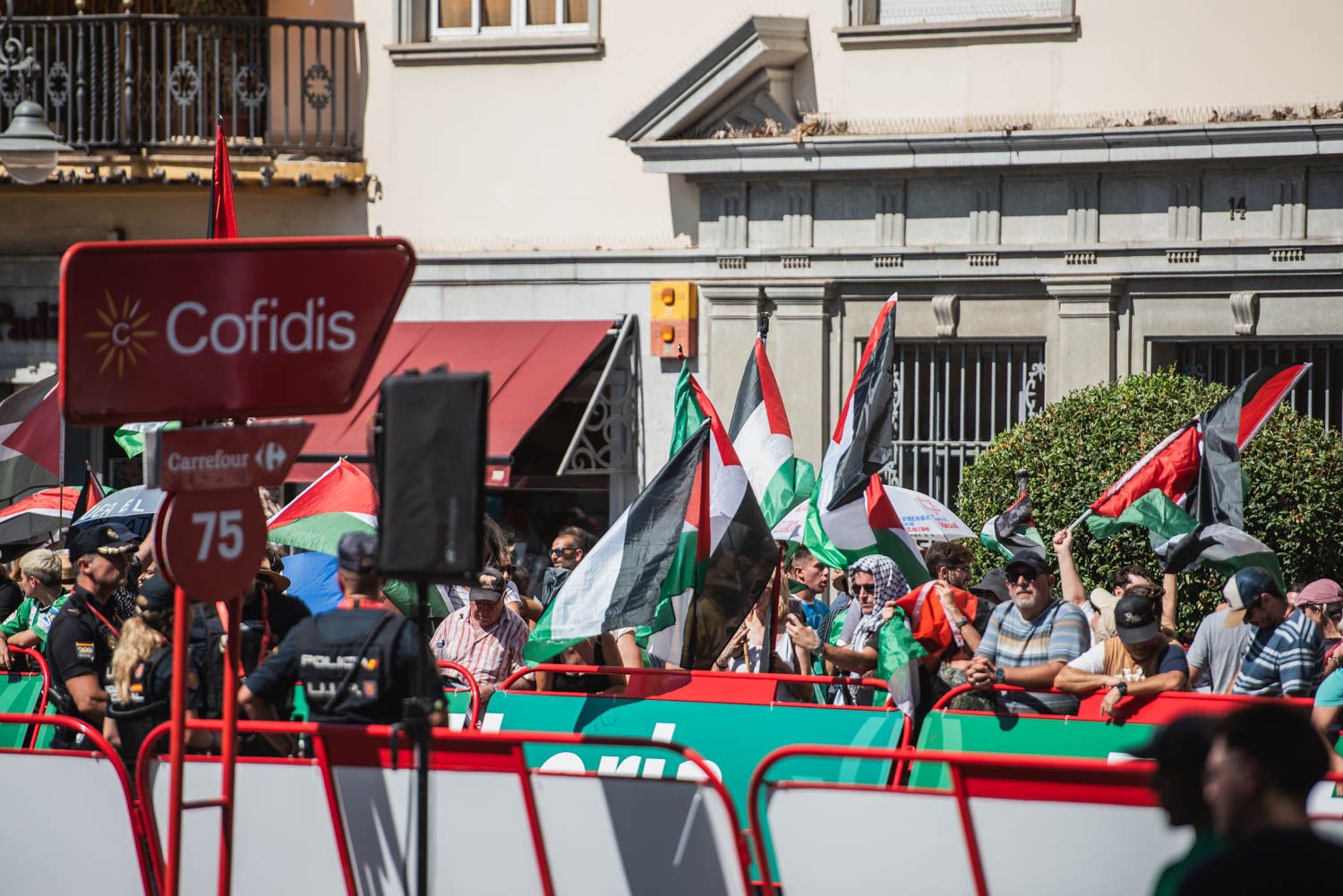 Hubo también protestas de algo más de una veintena de personas a la altura de la Maestranza. Colectivos propalestinos que volvieron a recordar que La Vuelta tiene entre sus equipos a uno que se dedica al llamado sportwahsing de Israel, en un año en que Gaza suma 40.000 muertos, y que no ha sido razón para la UCI para repensar su presencia.