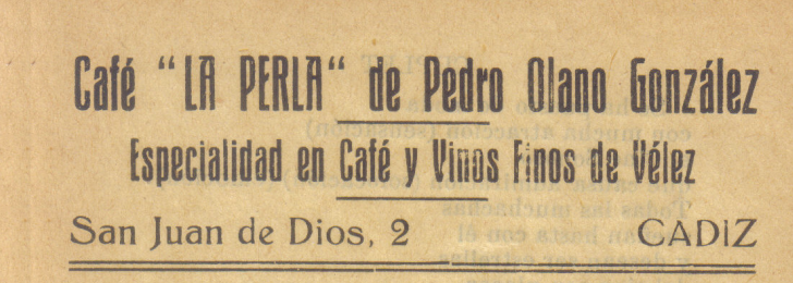 La apertura de La Perla se estima en 1929, ubicada en la cuesta de San Juan de Dios, frente por frente con la actual Residencia de San Juan de Dios. Allí se despachaban cafés y vinos de la Bodega Vélez de Chiclana. Un lugar estratégico entre el barrio de Santa María y la plaza San Juan de Dios, que gozó de una gran acogida, ya que dos años después, Olano compra la finca colindante, donde abriría El Pedrín.