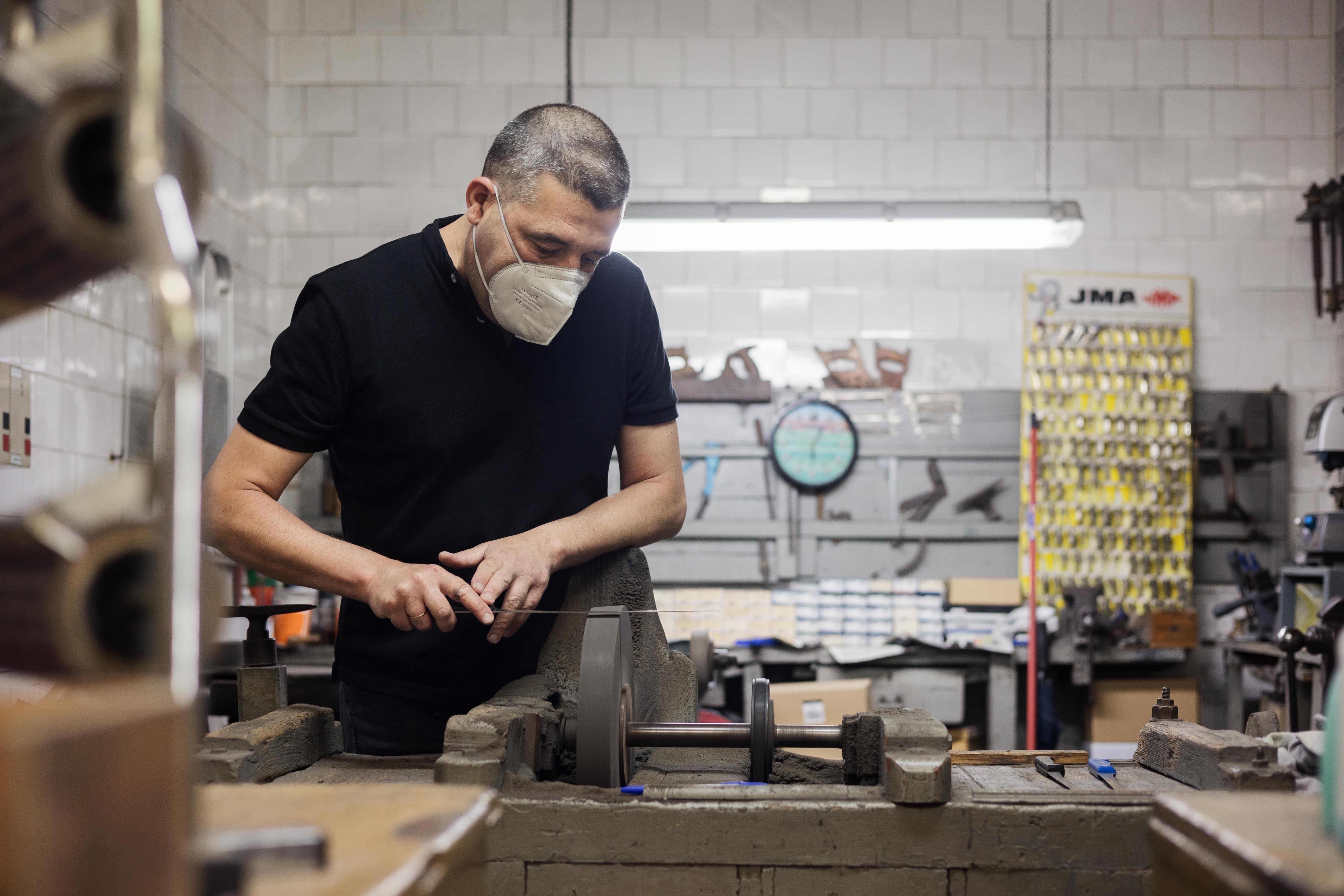 La cuarta generación de Serafines afiladores también comenzó a trabajar desde muy joven en este oficio. "Me crie en la casa de arriba de la cuchillería y a los 16 ya estaba trabajando aquí. Al principio compaginaba el instituto por la mañana y el trabajo por la tarde, pero después de cursar un FP, me metí de lleno en el negocio", asegura Serafín que ya lleva 37 trabajados a sus 53 años. "A veces se hace monótono, pero estoy contento con lo que hago y es bonito sentirse reconocido por este oficio", admite, aunque para la quinta generación, la de su hijo, no tiene tan claro que quiera que continúe. "Yo quiero que mi hijo haga lo que quiera, que se forme y se prepare, porque estoy es muy duro", espeta.