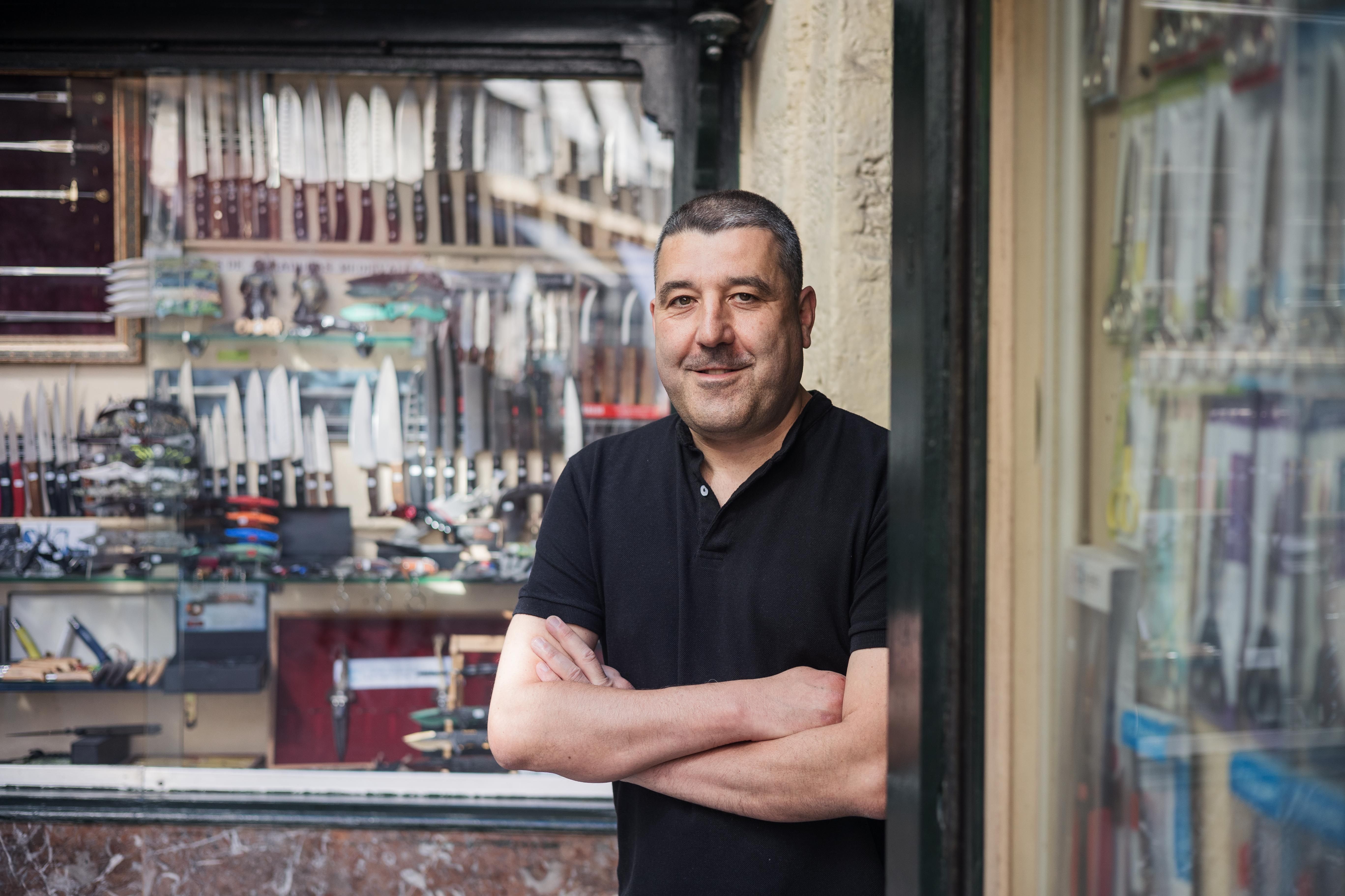 La rueda con la que afila los cuchillos no para de girar. "Está hecha de esmeril, el segundo mineral más duro después del diamante, esto suelta chispas y polvillo, que es nocivo y recubre las paredes, por lo que tengo que protegerme. Esto tampoco lo quiero para mi hijo, por eso le insisto en que no tiene la obligación de continuar con la tradición familiar si no quiere", aprecia. Unas vitrinas color beige se encuentran a un lado y otro del mostrador de la cuchillería, todas del s. XIX, de cuando su bisabuelo montó el negocio. Sin duda, historia viva de la ciudad. "Mucha gente entra a preguntar por el negocio y algunos turistas nacionales me traen sus cuchillos cada año para que se los afile", revela.