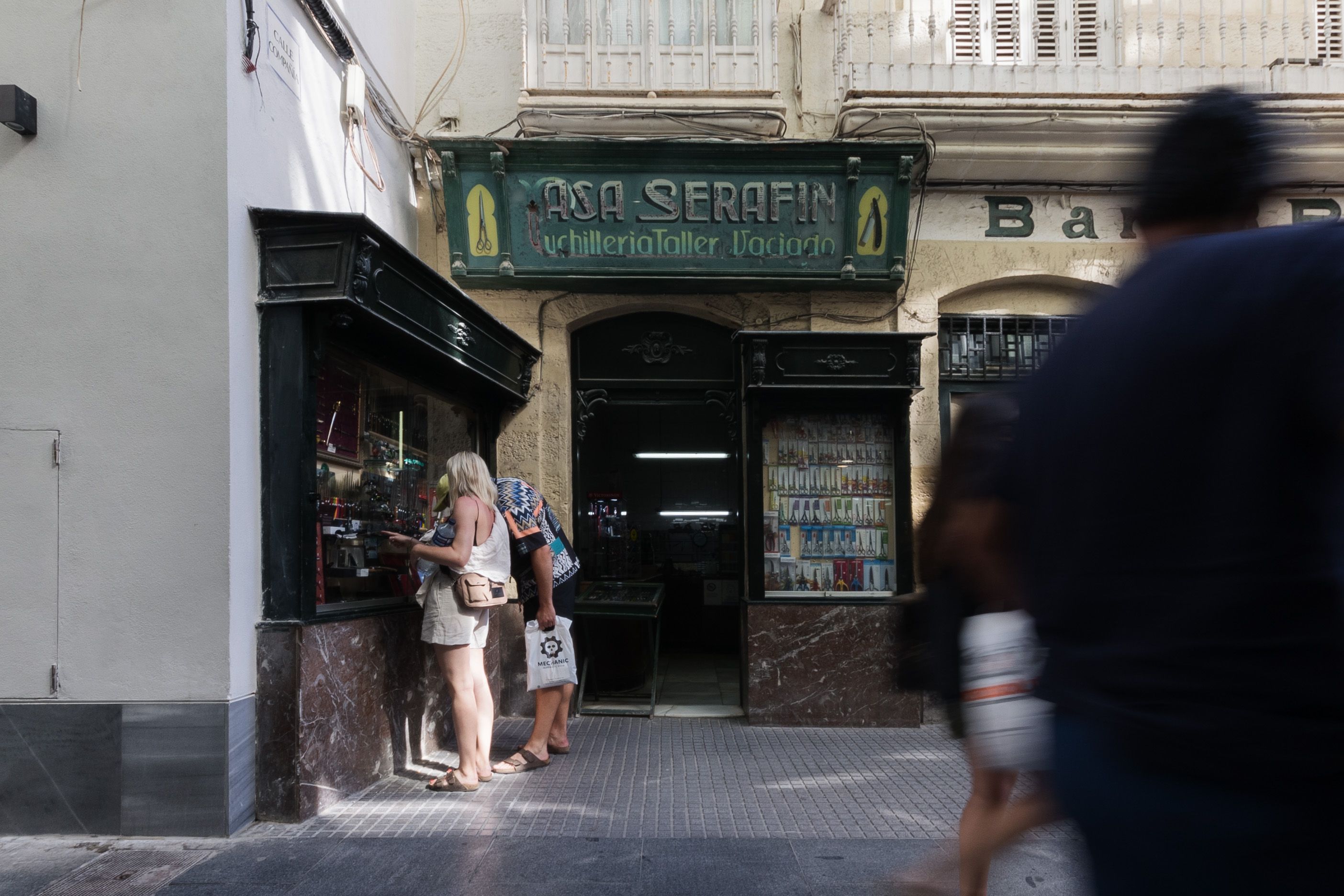 En la calle Compañía de Cádiz, junto al mítico Bar Brim, se encuentra Casa Serafín, una cuchillería del s. XIX que cuenta con cuatro generaciones. Serafín Gabriel Camacho, de 53 años, continúa con el oficio de su bisabuelo Serafín Gabriel Estevez, quien abrió la cuchillería en el número 3 de la calle Arbolí, en 1897. La historia de este negocio encuentra su origen en el norte de la península, como casi todos los que proliferan en la capital gaditana a finales del XIX, principios del XX.