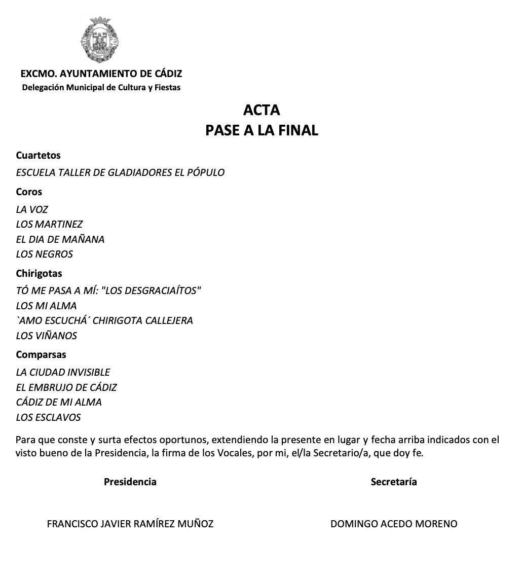 El jurado ha comunicado el fallo pasadas las tres de esta pasada madrugada. Ya hay finalistas del COAC 2023 para la Gran Final en el Teatro Falla de este viernes.