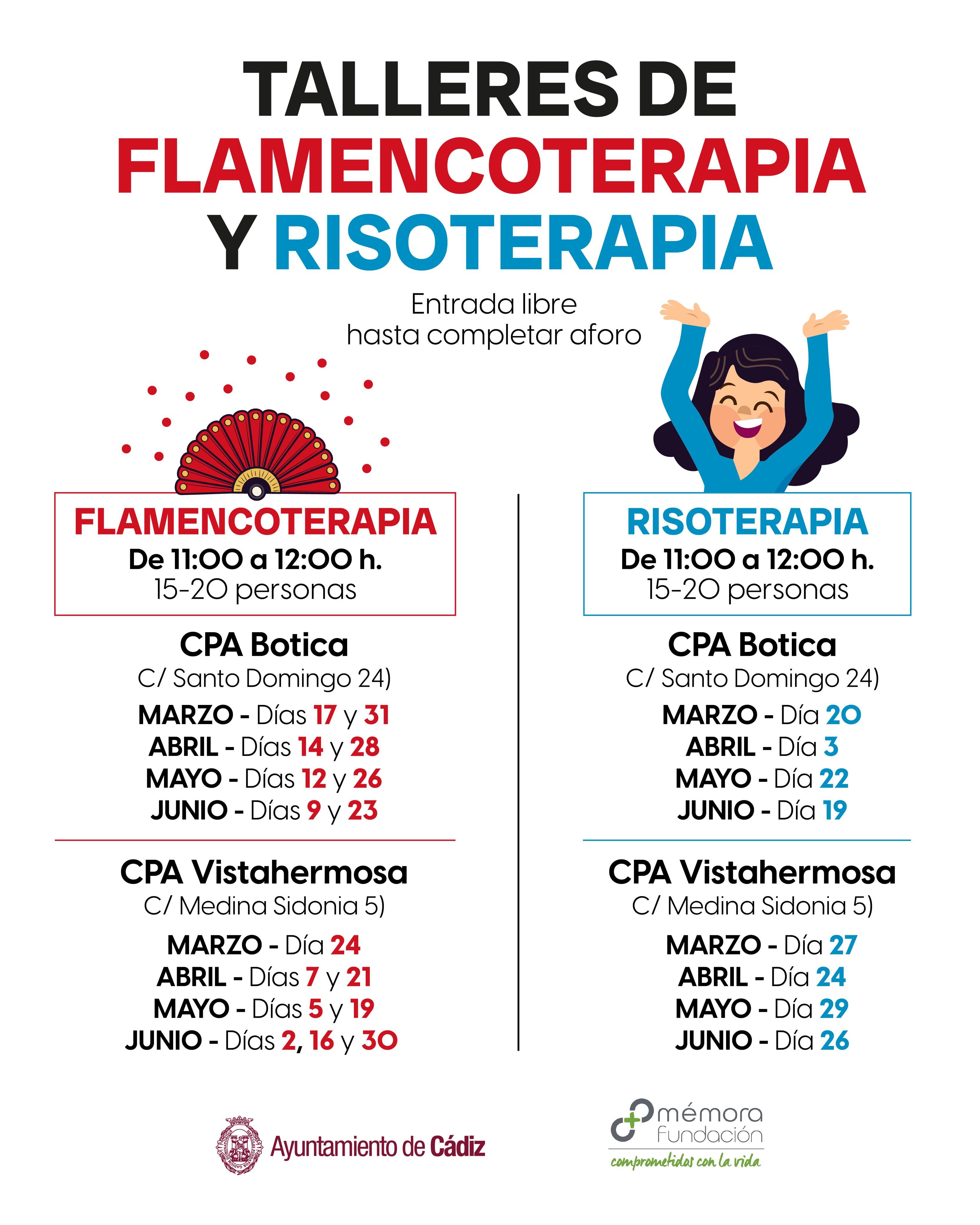 Por su parte, los talleres de risoterapia también se imparten en el mismo horario y con idéntico aforo. En el CPA Botica tendrán lugar el 3 de abril, el 22 de mayo y el 19 de junio, mientras que en el centro de Vistahermosa están programados para los días 24 de abril, 29 de mayo y 26 de junio.
