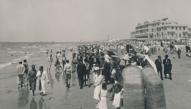 Una fotografía coloreada de la Playa de la Victoria, en Cádiz, en torno a 1929, descubre cómo se divertían los gaditanos y las gaditanas en su costa. Poco traje de baño y mucho albornoz.