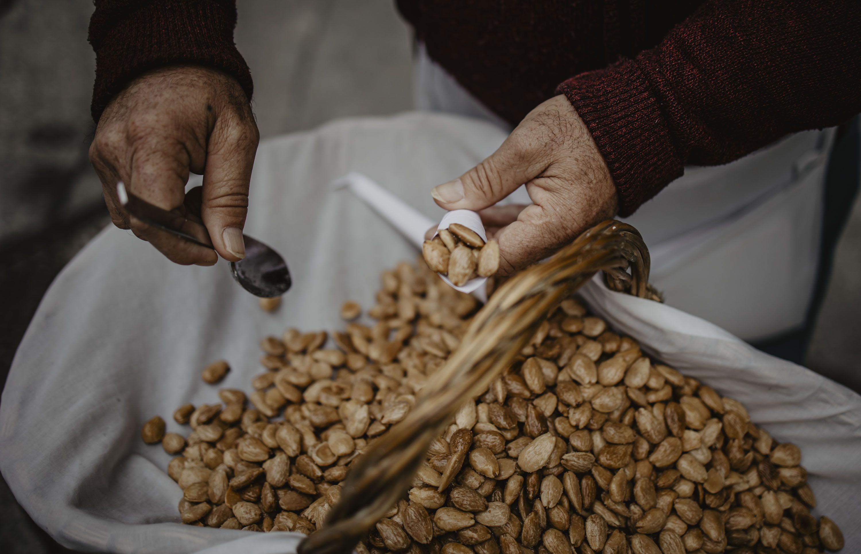 La fórmula es sencilla: conitos de papel de estraza gris que Jesús rellena con las almendras fritas por su mujer, María Dolores. Una cesta de mimbre repleta de almendras y con bien de sal gorda por encima hacen que familias enteras se paren continuamente para comprar un paquete por dos euros o la ofertita de dos por tres euros.