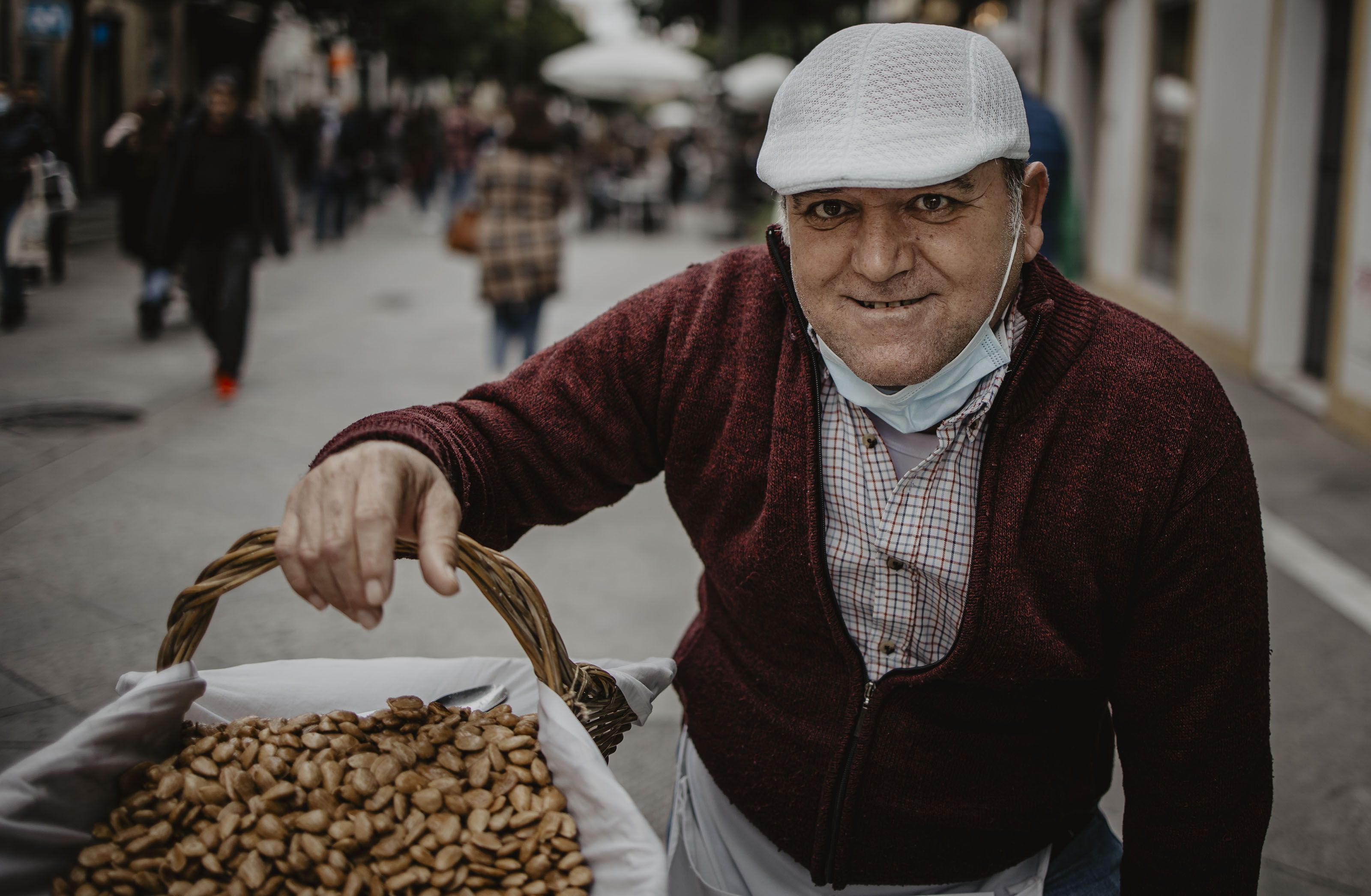“¡Almendritas buenas… las mejore!”, es lo que cada día se escucha a partir del mediodía en puntos como el Gallo Azul, la calle Algarve y la Plaza Plateros. Jesús Carrasco Guiza lleva 34 años dedicado a la venta callejera cesta en mano, de camarones en Valdelagrana y de almendras fritas en Jerez.