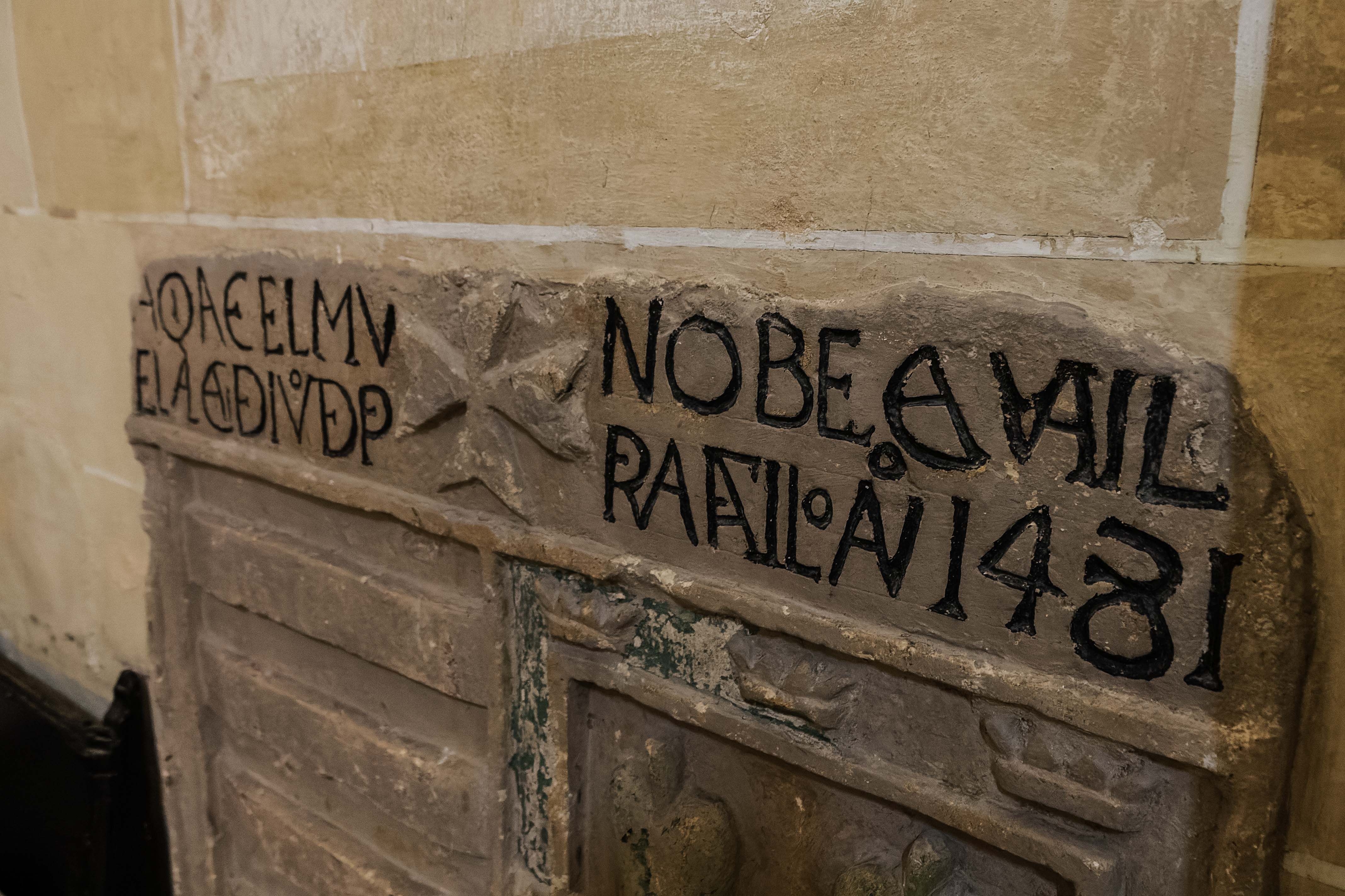 Otra lápida funeraria en este templo, de notable antigüedad (Siglo XV) es la situada en la pared lateral del templo donde antes hubo un retablo al Sagrado Corazón. En la misma, bien conservada aunque con repintes, se lee “AQVI IACE EL MVY NOBLE CAVALLERO EL ALCAIDE IUAN DE PEREA FALLECIO AÑO 1481”