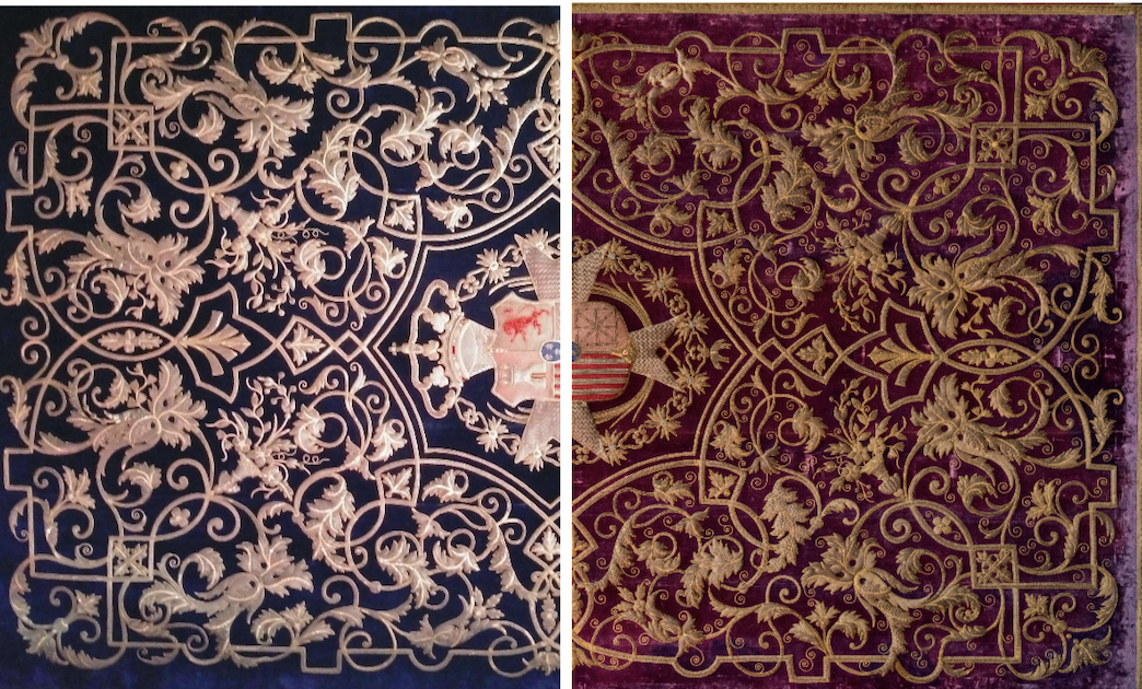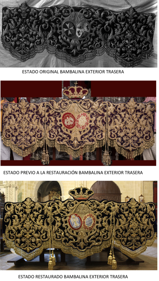 Como ejemplo de esto último, se desvela que las piezas bordadas de las bambalinas laterales exteriores habían sido cortadas para abrir los ojales por donde se introducen las pletinas de sujeción del techo de palio a los varales. Dichas piezas han sido reconstruidas por el taller, recuperándose el estado original de las mismas; de igual manera, gracias a la reconstrucción del diseño llevado a cabo, se ha ajustado la estructura del palio para que no afecten a los bordados de las bambalinas. Otro ejemplo lo podemos observar en la corona del escudo central del techo de palio, la cual ha recuperado dos hojas de apio del canasto que habían sido suprimidas.
