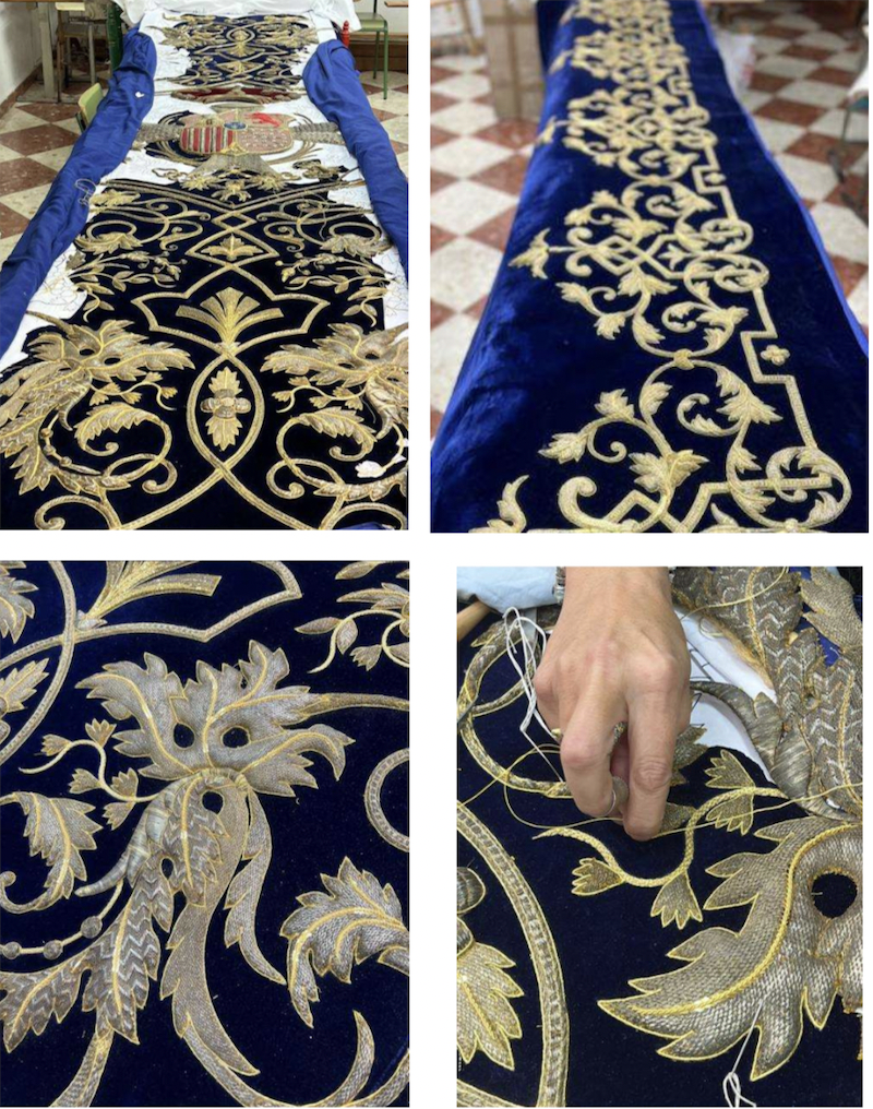 Todas las piezas se han colocado sobre un nuevo soporte de terciopelo azul de seda de gran calidad, adquirido por la hermandad para la restauración del manto de salida. Se han reproducido los borlones y flecos de borlas de las bambalinas, siguiendo el mismo diseño que el original.