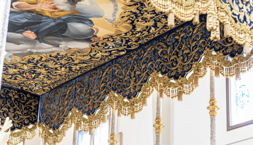 Las bambalinas, siguiendo el diseño del dibujo realizado por el sevillano Javier Sánchez de los Reyes, están bordadas en oro fino, plata fina y seda de colores sobre terciopelo de seda azul por José Luis Sánchez Expósito y su Taller de Bordados Santa Clara.