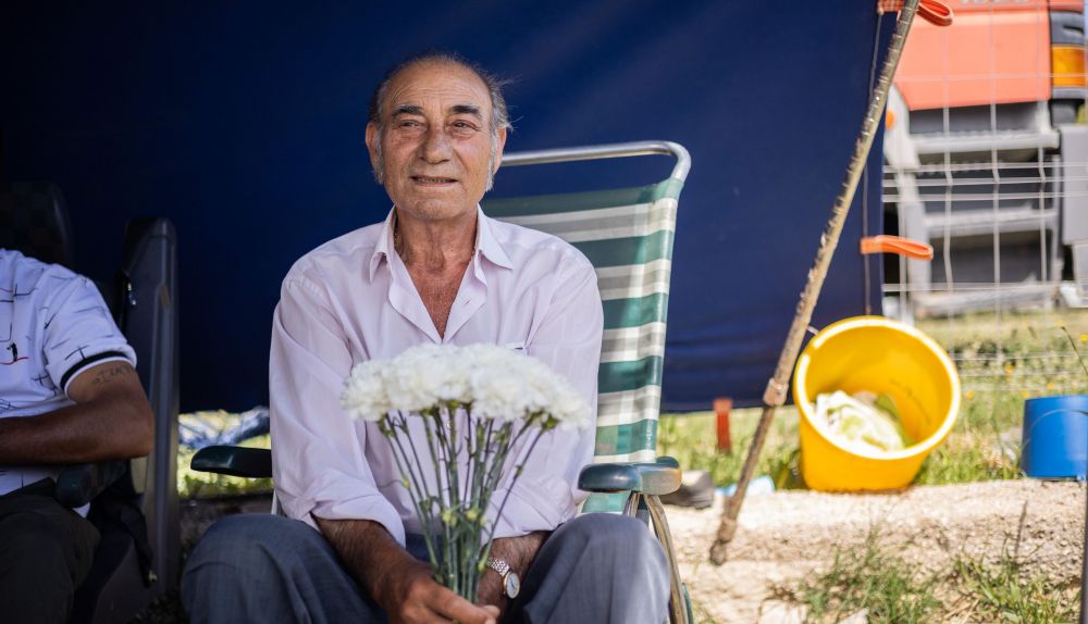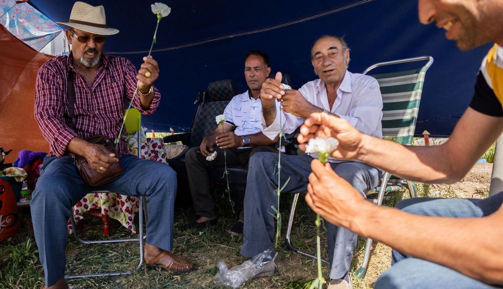 Bajo la sombra de un toldo, sentados en hamacas, varios hombres ya han comenzado a deshojar tallos. Ángel, natural de Navalmoral de la Mata, en Cáceres, acumula 35 años de ferias a sus espaldas. “Aquí ya nos conocemos todos”, comenta el patriarca rodeado de compañeros. “Aquí preparamos los claveles, mira como está todo el suelo de tallos”, dice Santiago, señalando la zona. Este madrileño ya conoce el oficio después de llevar 45 años desplazándose de feria en feria.