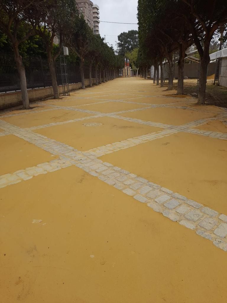 El avance de las obras ya se percibe en el parque González Hontoria, recinto ferial que presentaba un alto nivel de degradación con baches y socavones. Los trabajos de reforma y adecuación del albero servirán para engalonar el espacio que pisarán los amantes del vino y los volantes del 7 al 14 de mayo.