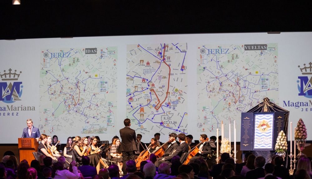 Hora y media necesitó la Unión de Hermandades de Jerez para presentar el cartel y los datos de la procesión Magna del 12 de octubre. Lo que dura un partido de fútbol. Lo que dura, de media, una película. Y la película tuvo un guion con siete discursos, varias interpretaciones de marchas por la Orquesta Joven Campos Andaluces y poco más, excepto el desmayo de una persona asistente.