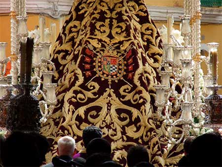 Así, esta magnífica pieza de los talleres de Fernández y Enriquez será la visión definitiva que se vea en la procesión. Se trata de un manto burdeos de terciopelo de Lyon con bordados en oro, una pieza estrenada en el año 1997, y popularmente se le conoce como ‘el manto de la duquesa’, pues es una de las tantas donaciones que Cayetana Fitz James Stuart y Silva, Duquesa de Alba, hizo a lo largo de su vida a su Hermandad de los Gitanos.