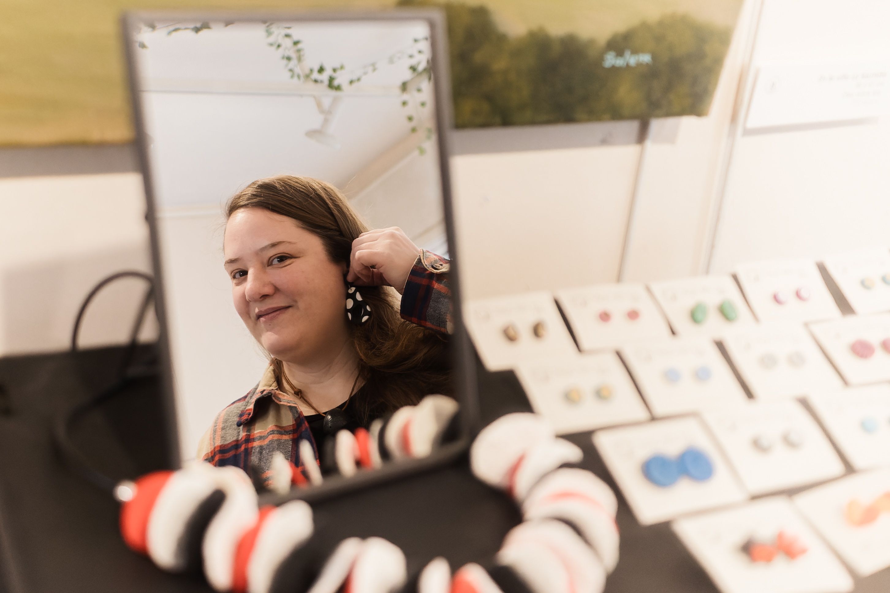 Un paseo por el mercado permite descubrir otros trabajos artísticos como el de la ceramista Gloria Aranda, de 41 años, nacida en Valladolid pero “casi toda la vida” en Jerez. La artesana, bajo la firma Clay Cats, muestra una colección de pendientes de diferentes tamaños y formas. Es la primera vez que participa en un evento de esta temática. “Como no tengo cacharrería flamenca, he traído pendientes”, ríe la vallisoletana que se inició en la artesanía con la arcilla polimérica hace 20 años.