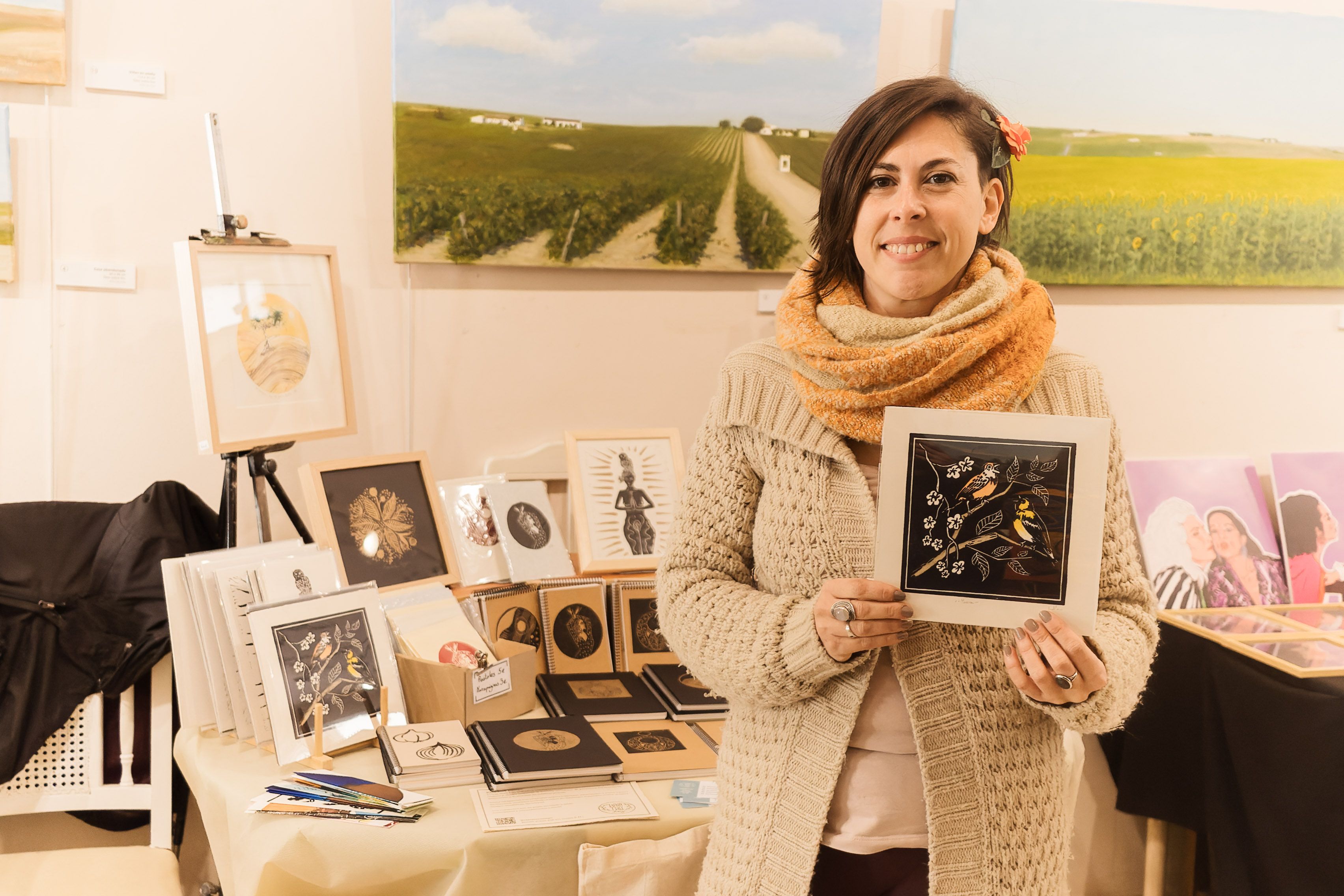 Su obra suele basarse en la figura humana, en los animales, en la naturaleza o en la vegetación, pero en esta ocasión ha desarrollado una serie exclusiva para el Festival, algo que ya experimentó en otra edición. “Este año le he dado una vuelta de tuerca a lo que tenía”, comenta la jerezana. Detrás de ella se divisan dos paisajes. “Me inspiro en el entorno natural de Jerez, la campiña, los olivares, los colores de los atardeceres, los tonos amarillos del verano”, detalla.